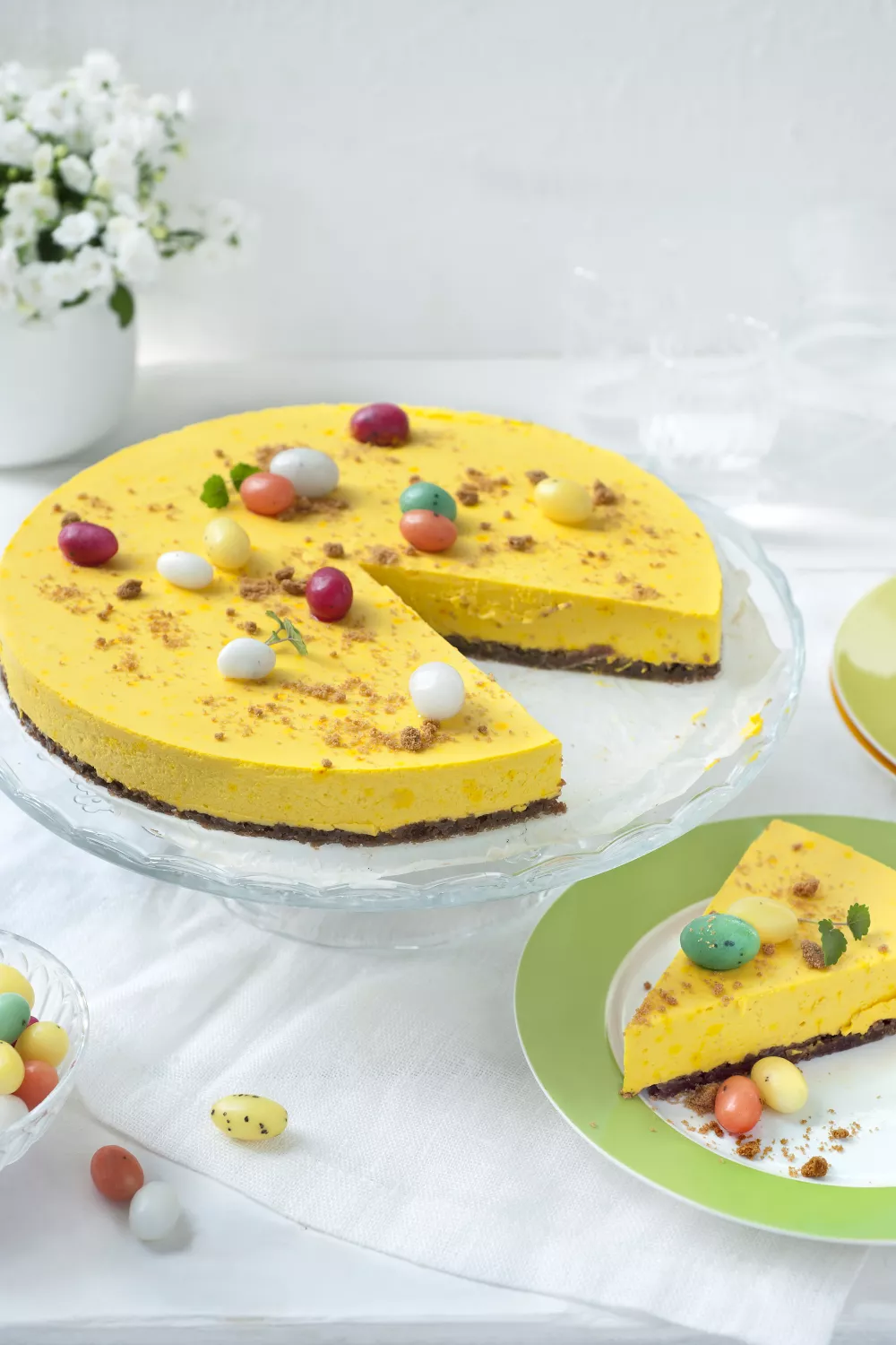 Deze romige paastaart combineert een krokante chocoladebodem met een frisse citroenlaag van platte kaas en zure room. De bereiding is eenvoudig: een kortgebakken koekbodem, een zachte kaasmix met gelatine en even opstijven in de koelkast voor een zijdezacht resultaat. Ideaal als feestelijk lente dessert voor Pasen of bij de koffie, af te werken met suikereitjes en extra citroenzeste.