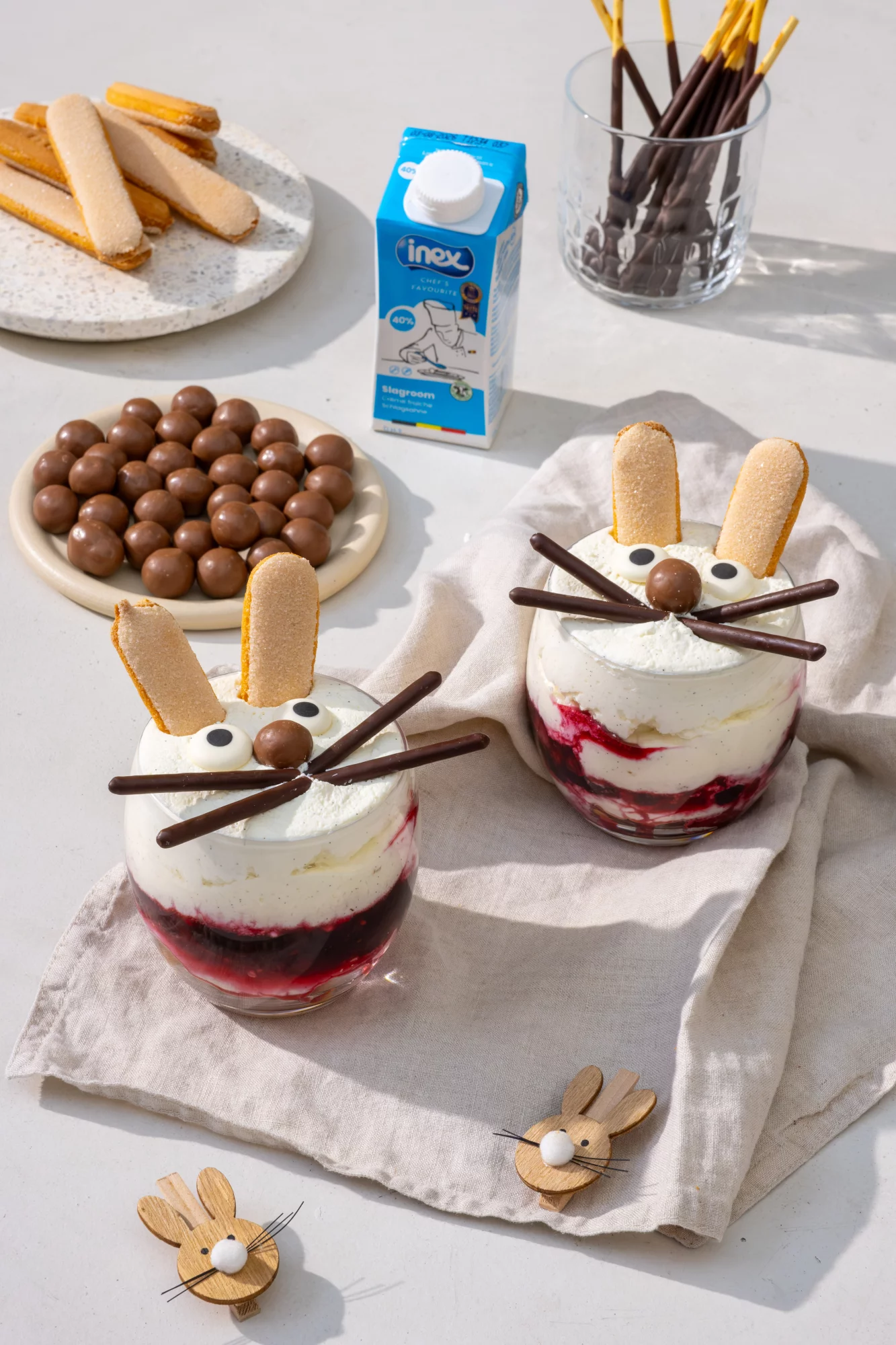 Vier Pasen met deze feestelijke paastiramisu met rood fruit, perfect voor op tafel in glaasjes. De romige mascarponecrème combineert heerlijk met het zachte rood fruit en de licht sinaasappelsmaak van de lange vingers. Met een creatieve finishing touch maak je van elk glaasje een schattig konijnengezichtje, ideaal om kinderen én volwassenen te verrassen. Dit dessert is makkelijk voor te bereiden en een kleurrijke blikvanger tijdens de paasbrunch.
