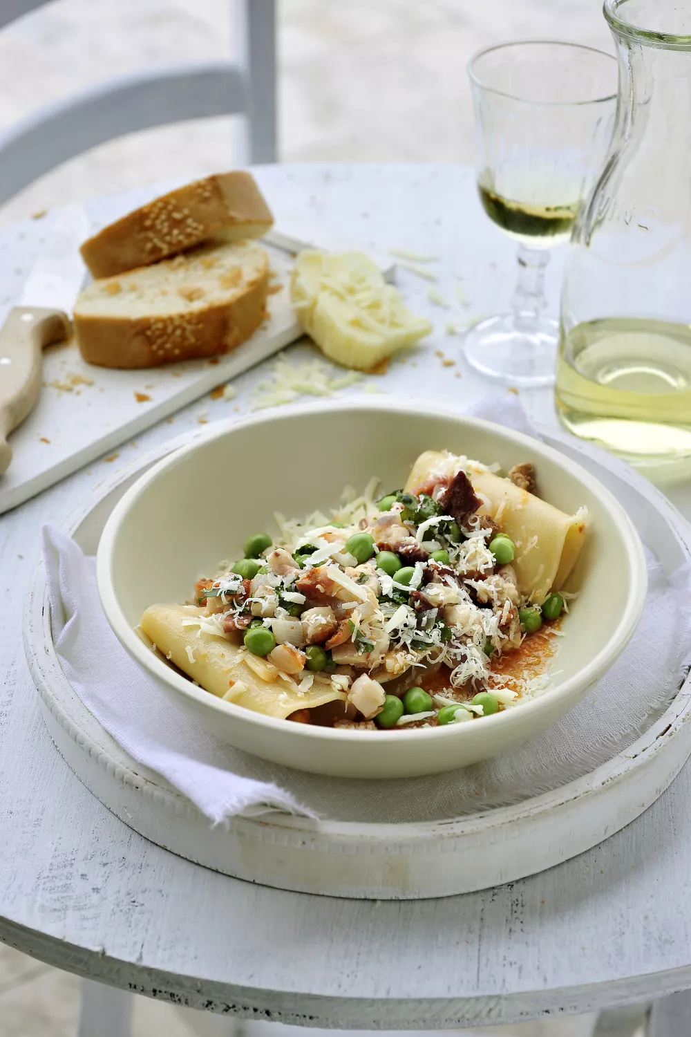 Lepel de pasta met het mengsel van erwtjes en varkenswang in een diep bord. Rasp er met een heel fijne rasp nog wat pecorino over zodat die als sneeuw over de bereiding valt.