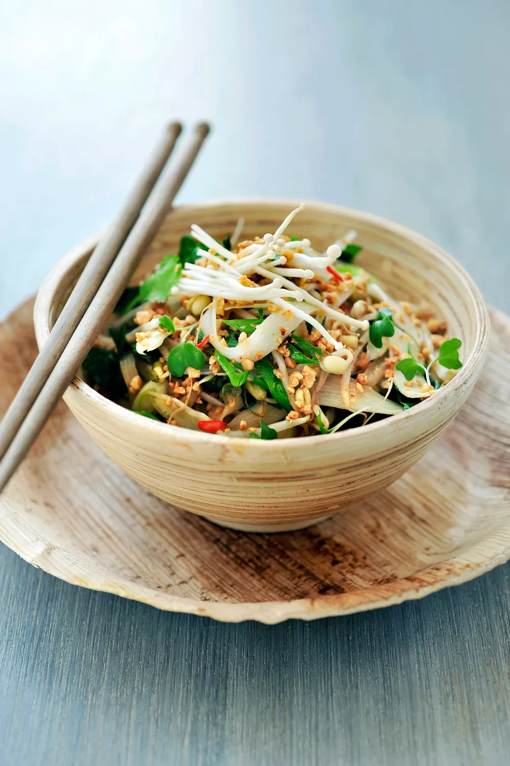 Deze asperge pad thai brengt frisse lente op tafel met knapperige aspergeslierten, sojascheuten, enoki of shiitakes en zeespaghetti voor een zilte toets. In de wok krijgt het gerecht een snelle rokerige smaak door knoflook, gember, ketjap en rijstazijn, afgewerkt met koriander en geroosterde pinda's. Perfect als lichte Aziatisch geïnspireerde avondmaaltijd of snelle lunch.