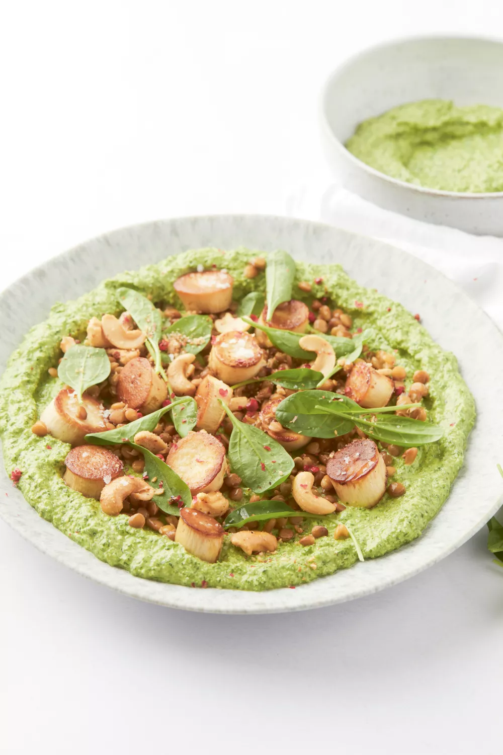 Deze paddenstoel coquilles van koningsoesterzwammen combineren goudbruin gebakken textuur met een frisse peterseliepesto van babyspinazie en cashewnoten, geserveerd op een bedje van bruine linzen. Het eenvoudige maar verfijnde gerecht is ideaal als herfstig voorgerecht of licht hoofdgerecht voor etentjes en is makkelijk vegan aan te passen. Geroosterde cashewnoten en roze peperbollen geven extra knapperigheid en pittige tonen.