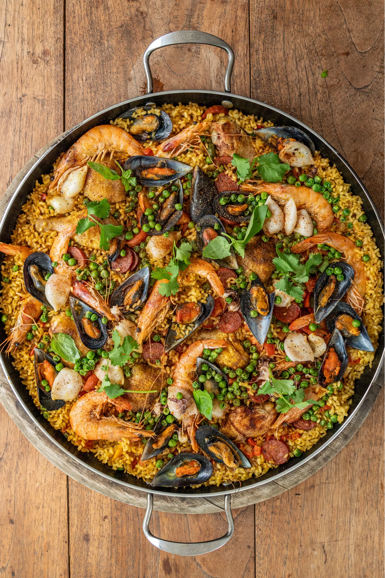 Paella is hét symbool van de Spaanse keuken: een feestelijke schotel vol saffraangele rijst, kip, zeevruchten en kruidige aroma’s. In deze versie combineren we kippenboutjes, chorizo, gamba’s, inktvis en mosselen tot een rijke, hartige paella die bruist van mediterrane smaken. De geur van saffraan, knoflook en olijfolie brengt je meteen naar de zonnige kust van Valencia, waar paella ooit zijn oorsprong vond. Perfect om te delen met familie of vrienden, rechtstreeks uit de pan!