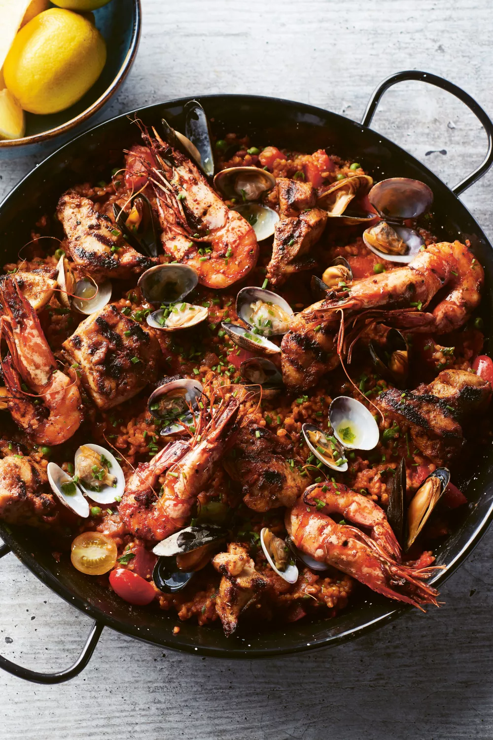 Deze paella mixta combineert sappige kippendijen, gegrilde gamba's en zilte mosselen met kruidige sobrasada, saffraan en gerookte paprikapoeder voor een rijk en zonnig mediterraan smaakpalet. De Bomba paellarijst wordt kort mee gestoofd, geblust met het schelpdierenvocht en vervolgens langzaam gesudderd tot de perfecte textuur met een licht krokant korstje onderaan. Perfect voor een zomerse borrel of gezellige feestmaaltijd, afgewerkt met citroen, bladpeterselie en olijfolie.