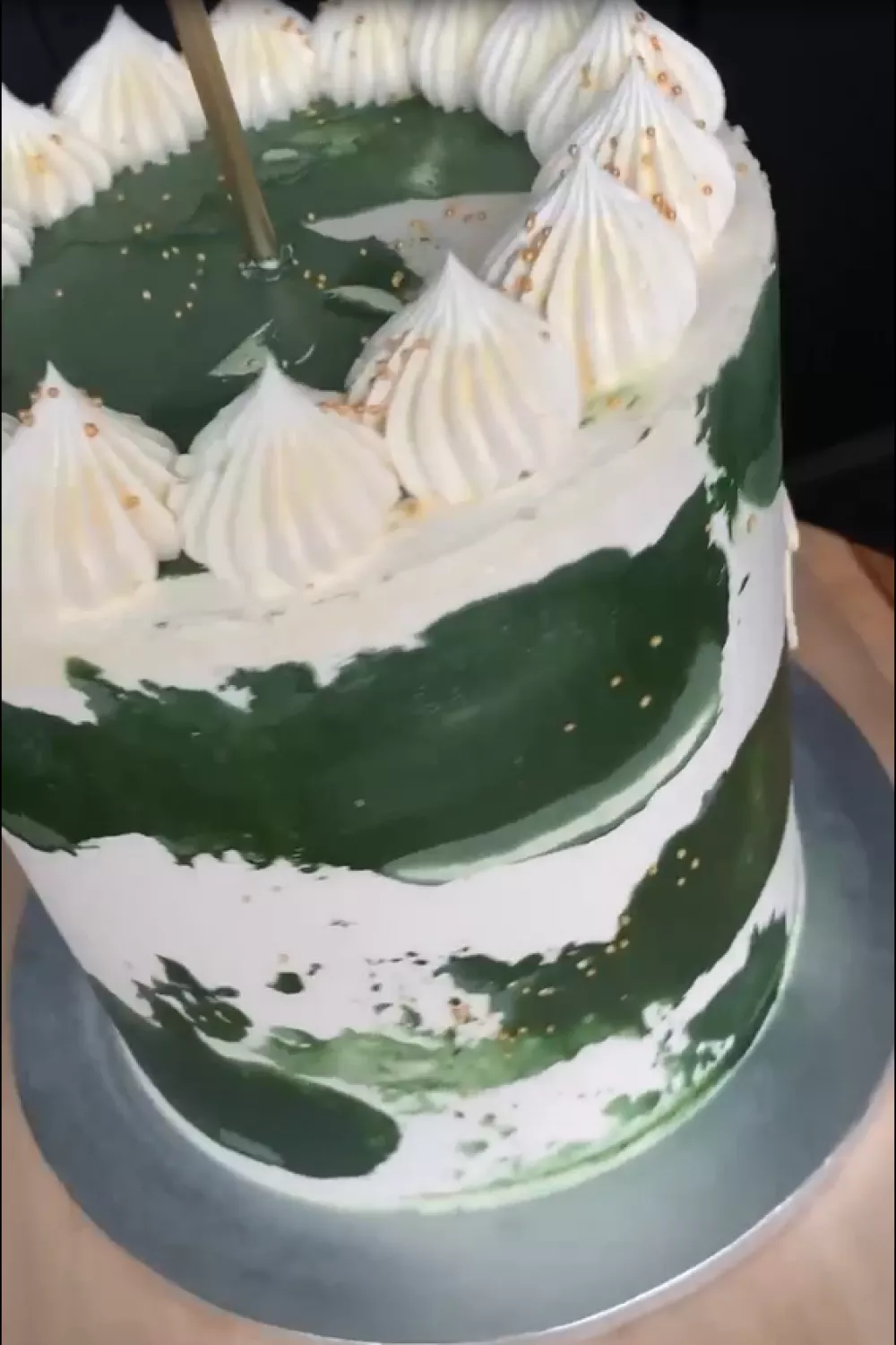 Om af te werken draai je met je draaitafel en gooi je enkele sprinkles richting de taart. Doordat de botercreme nog niet hard is, blijft deze kleven. Voor een meer drama look kan je ook met een penseel verf spatten op de taart.