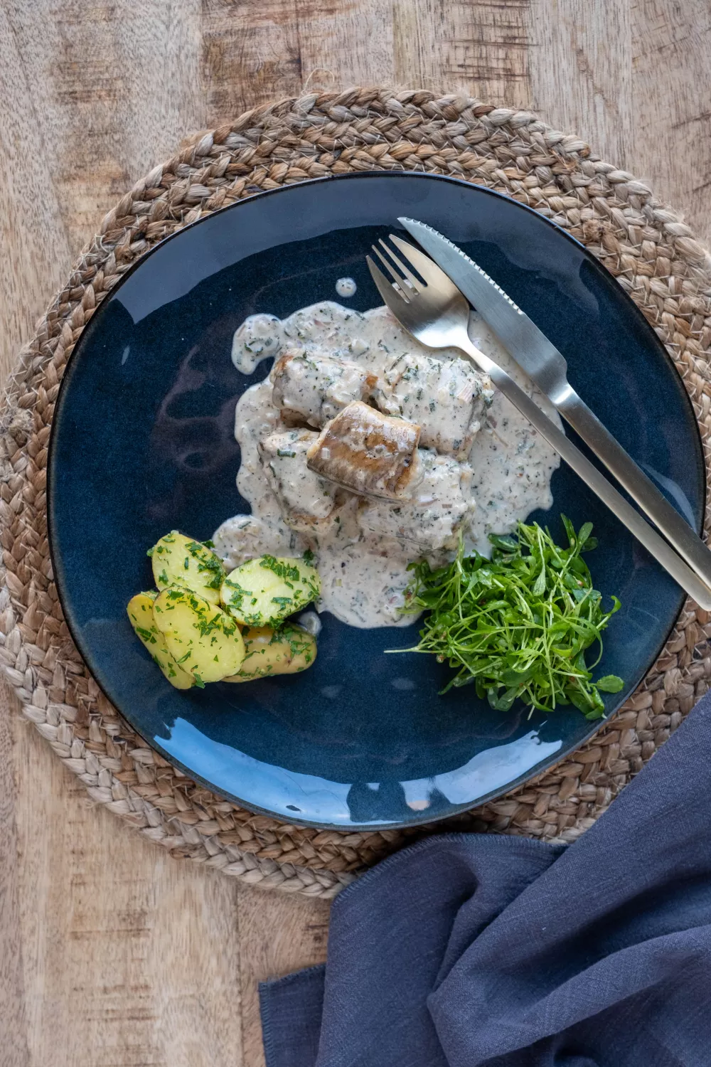 Zachte stukken paling in een romige roomsaus met witte wijn en salie vormen een verfijnd maar toch huiselijk visgerecht. Krokig gebakken paling uit de pan met eenvoudige gekookte aardappelen en peterselie en een fris handje tuinkers erbij zorgt voor balans en kleur op het bord. Een vleugje graanmosterd en citroen houdt de smaken levendig en maakt dit ideaal voor een sfeervol diner of een seizoensgebonden maaltijd.