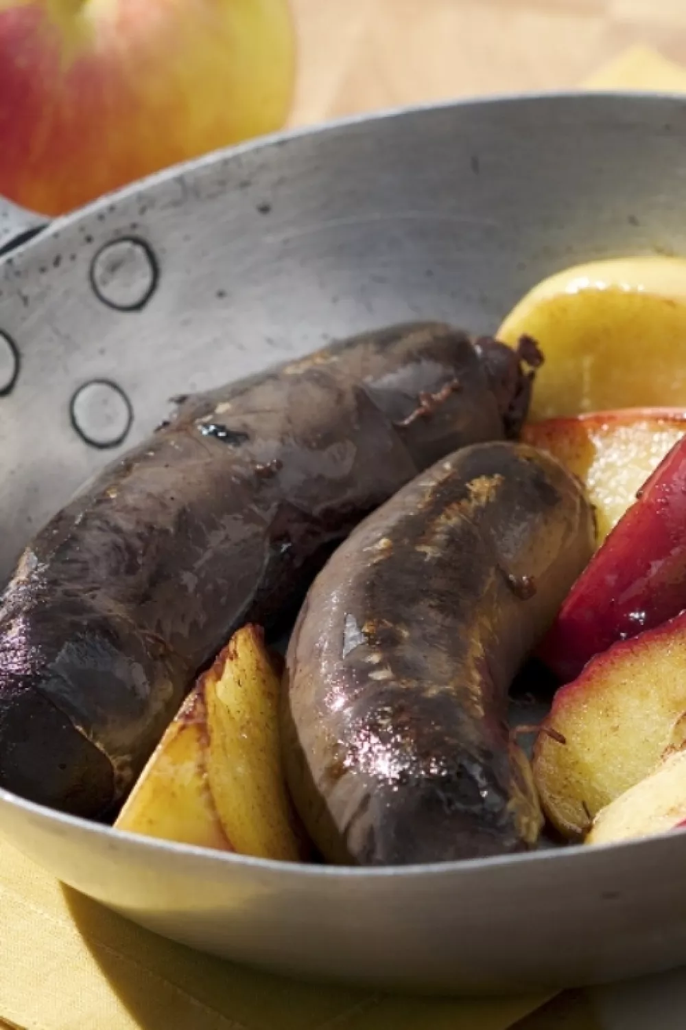 Haal de vliesjes van de bloedworsten en snij ze vervolgens in stukken. Schil de appel en snij in dunne plakjes.