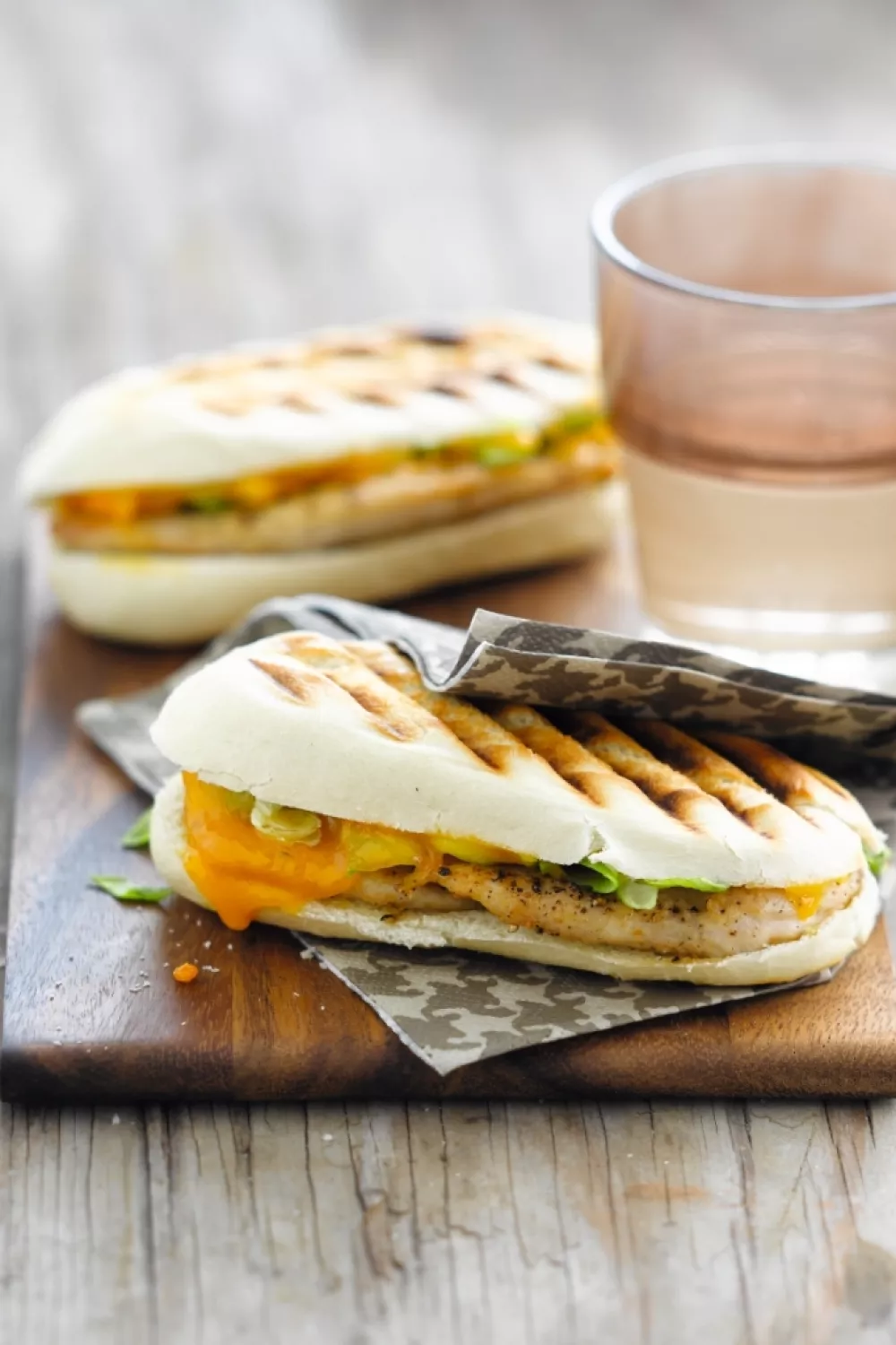 Een warme panini met goudbruin gegrild stokbrood, gesmolten cheddar en malse kipfilet op een bedje van frisse lente-ui en aromatische dragon. Deze snelle grillpan klassieker is perfect als doordeweekse lunch of zomerse picknick en combineert romige kaas met hartige kip en kruidige dragon. Simpel te bereiden en ideaal voor gezellige maaltijden of een snelle borrelhap.