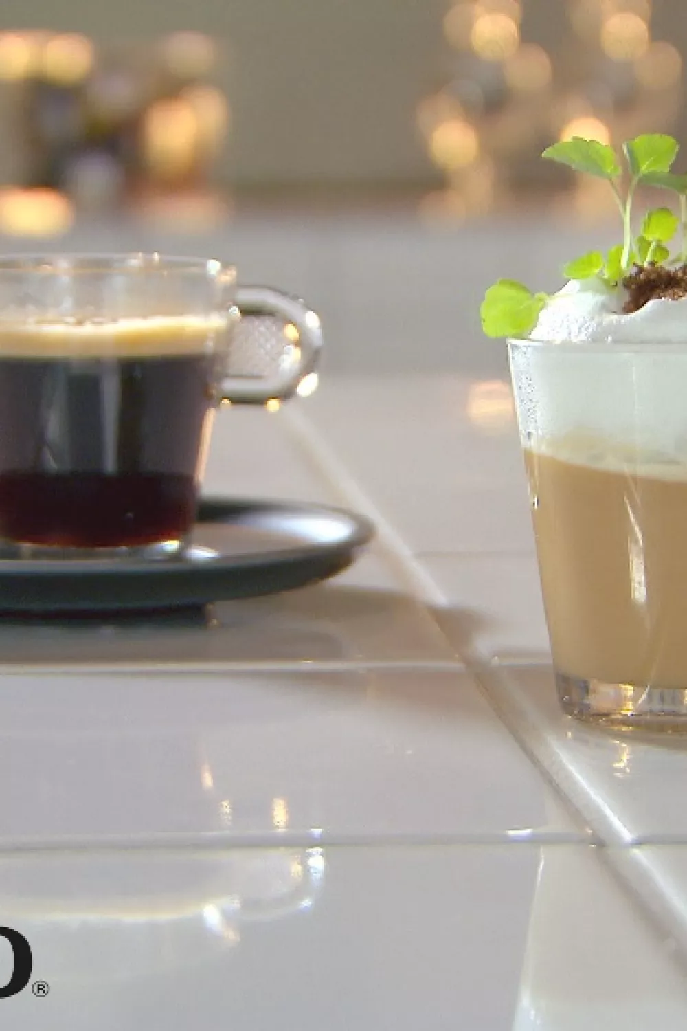 Haal de glaasjes panna cotta uit de koelkast. Maak melkschuim in de Nespresso melkopschuimer. Bedek elk glaasje panna cotta met een laagje melkschuim en verkruimel er de koffiecrumble over. Werk af met enkele blaadjes astina cress zoethout.