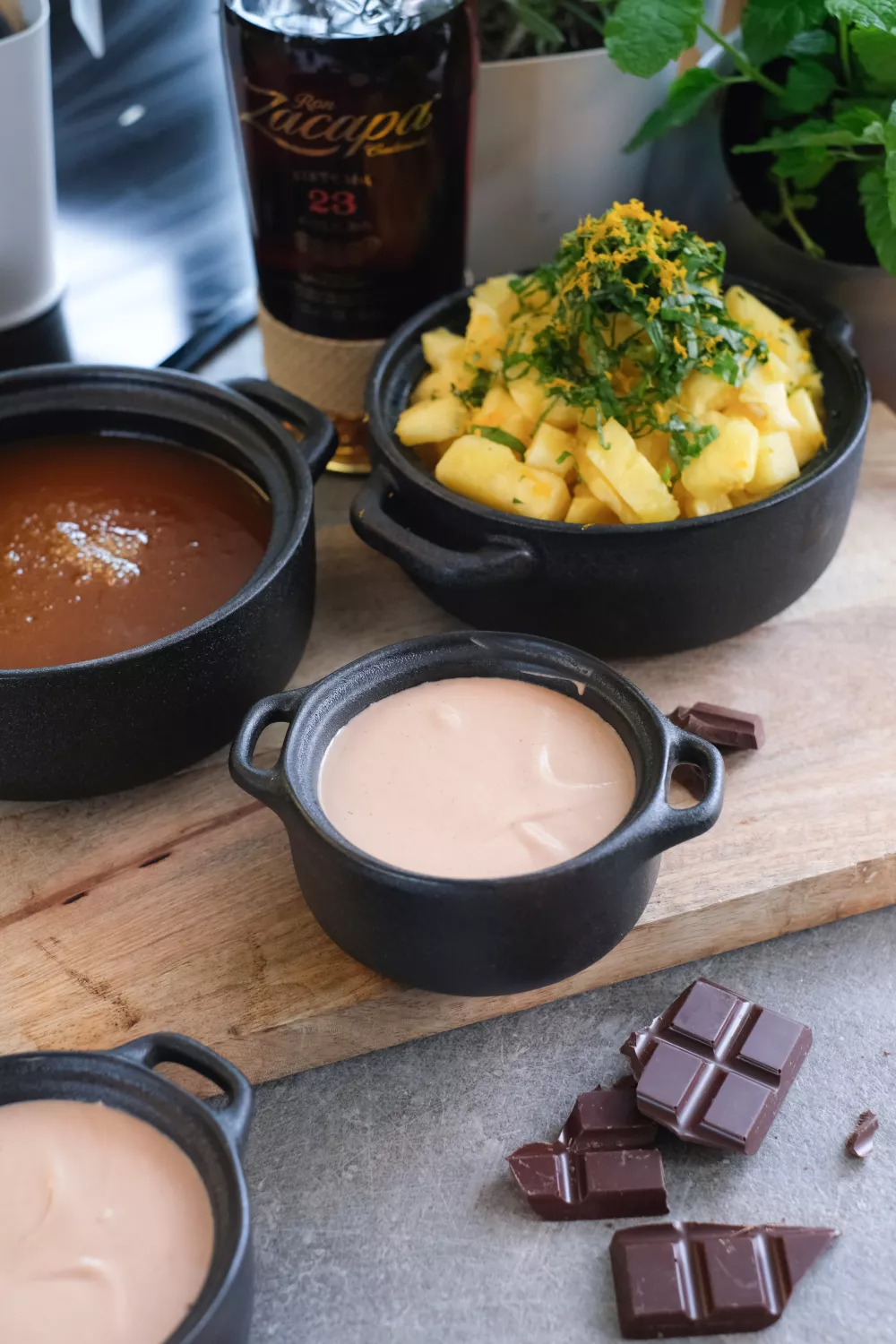 Zachte vanillepanna cotta met een vleugje rum en pure chocolade krijgt extra body van Griekse yoghurt en luchtig geklopte room, een elegant dessert voor feestelijke diners. Erbij een aromatische karamelsaus met tijm en rozemarijn en een frisse ananassalade met de zeste van limoen en sinaasappel brengt tropische frisheid, perfect voor de zomer. Het recept combineert karamelliseren, infusie van vanille en kruiden en het opstijven van gelatine voor een romige, luchtige textuur.