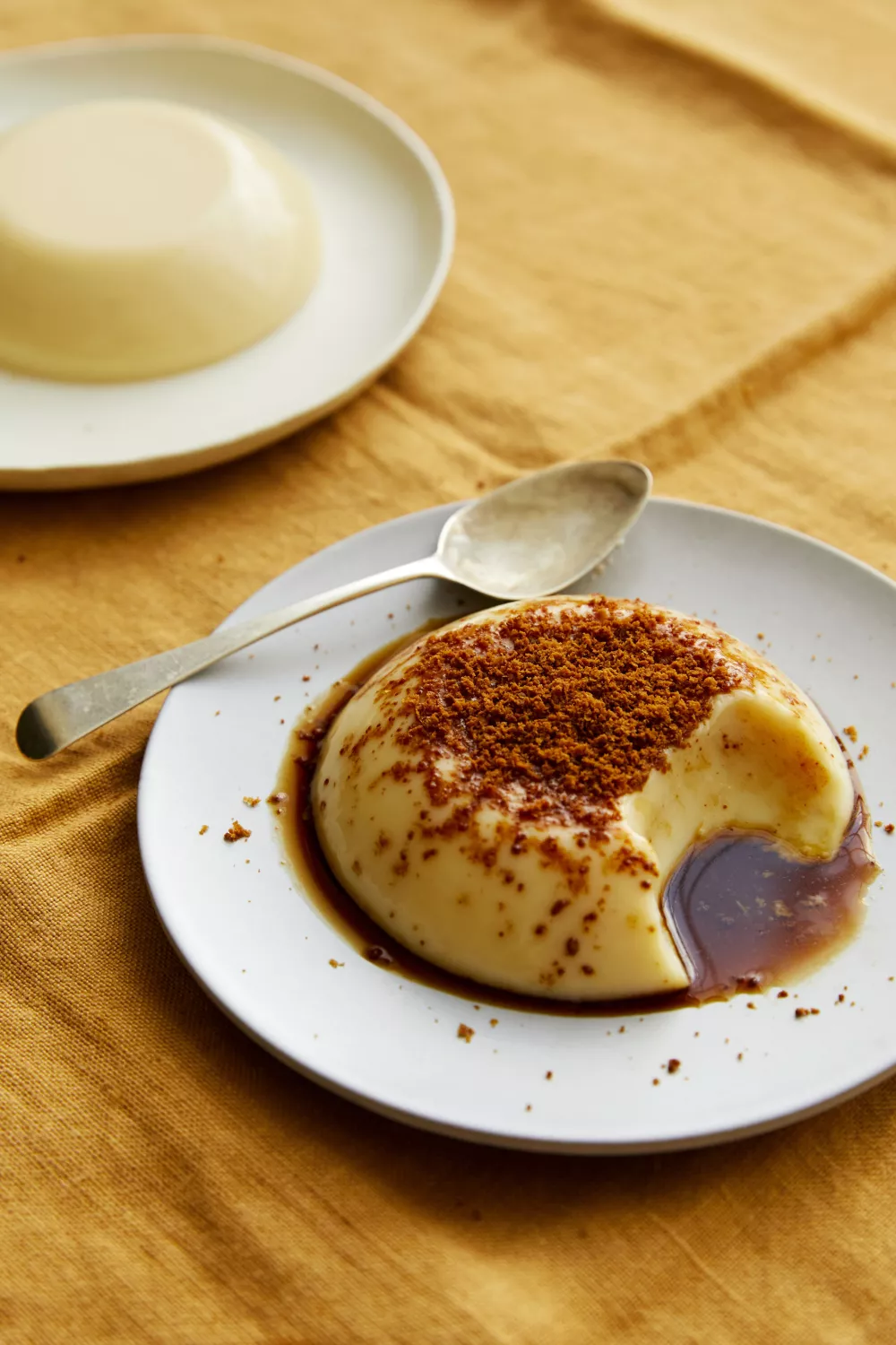 Schenk het koffiemelkmengsel in vormpjes, 150-160 gram per portie. Laat minstens 2 uur in de koelkast opstijven, maar je kunt de panna cotta 3 dagen van tevoren maken.