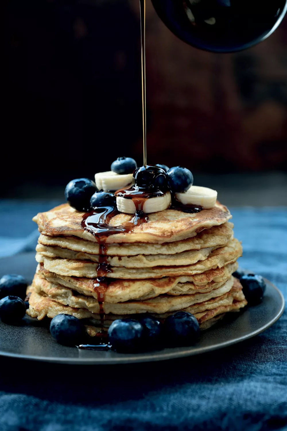 Serveer met verse banaan, bosbessen of ander fruit en met ahornsiroop.
