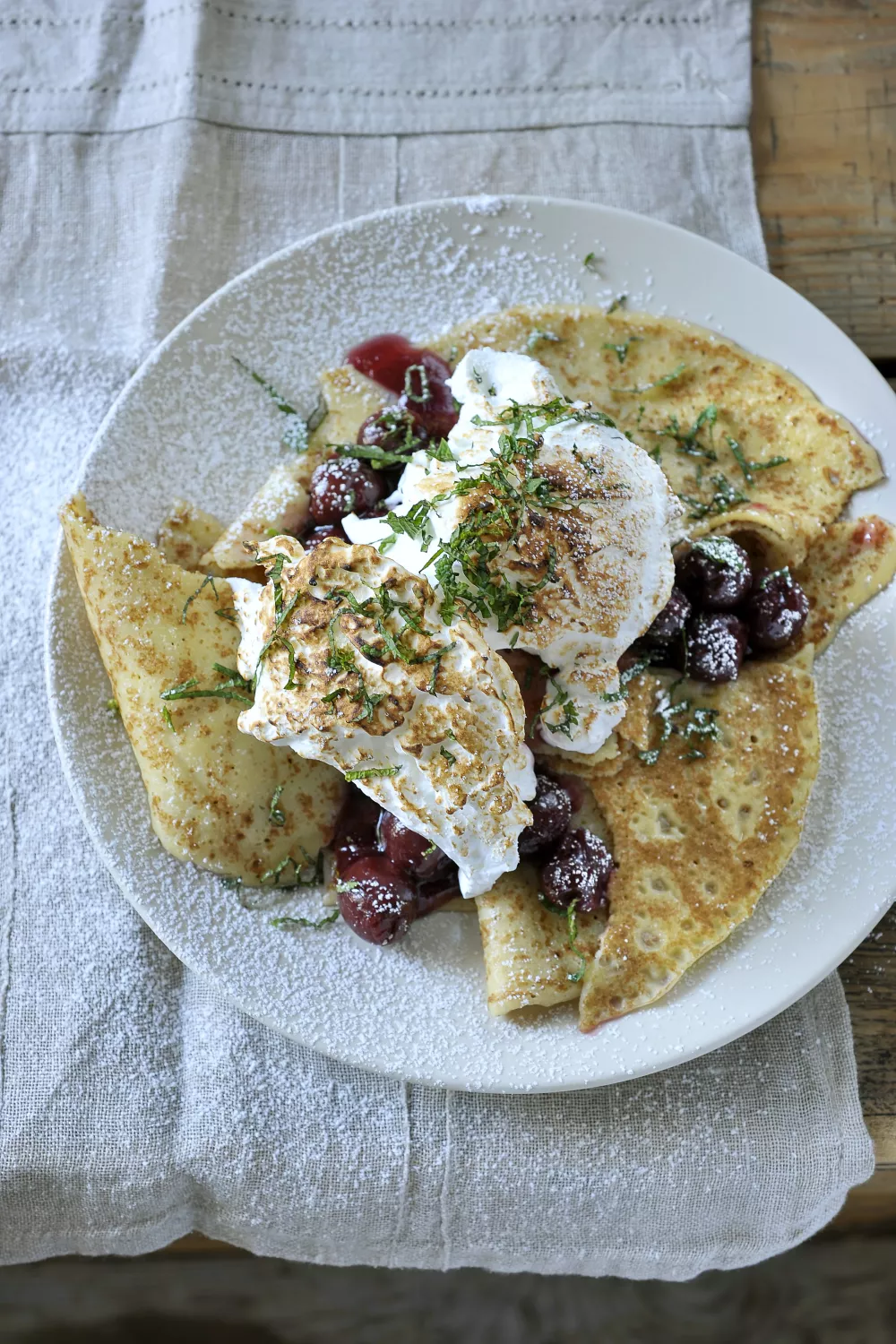 Luchtige pannenkoeken met warme kriekensaus en fluweelzachte meringue vormen een feestelijk dessert dat ook perfect past bij brunch of een zomerse picknick. De krieken worden ingekookt met limoen, citroengras, kaneel en vanille tot een glanzende saus, terwijl de meringue klassiek met hete suikersiroop wordt opgeklopt en met een keukenbrander goudgeel wordt gebrand. Werk af met fijngehakte munt voor een frisse toets.