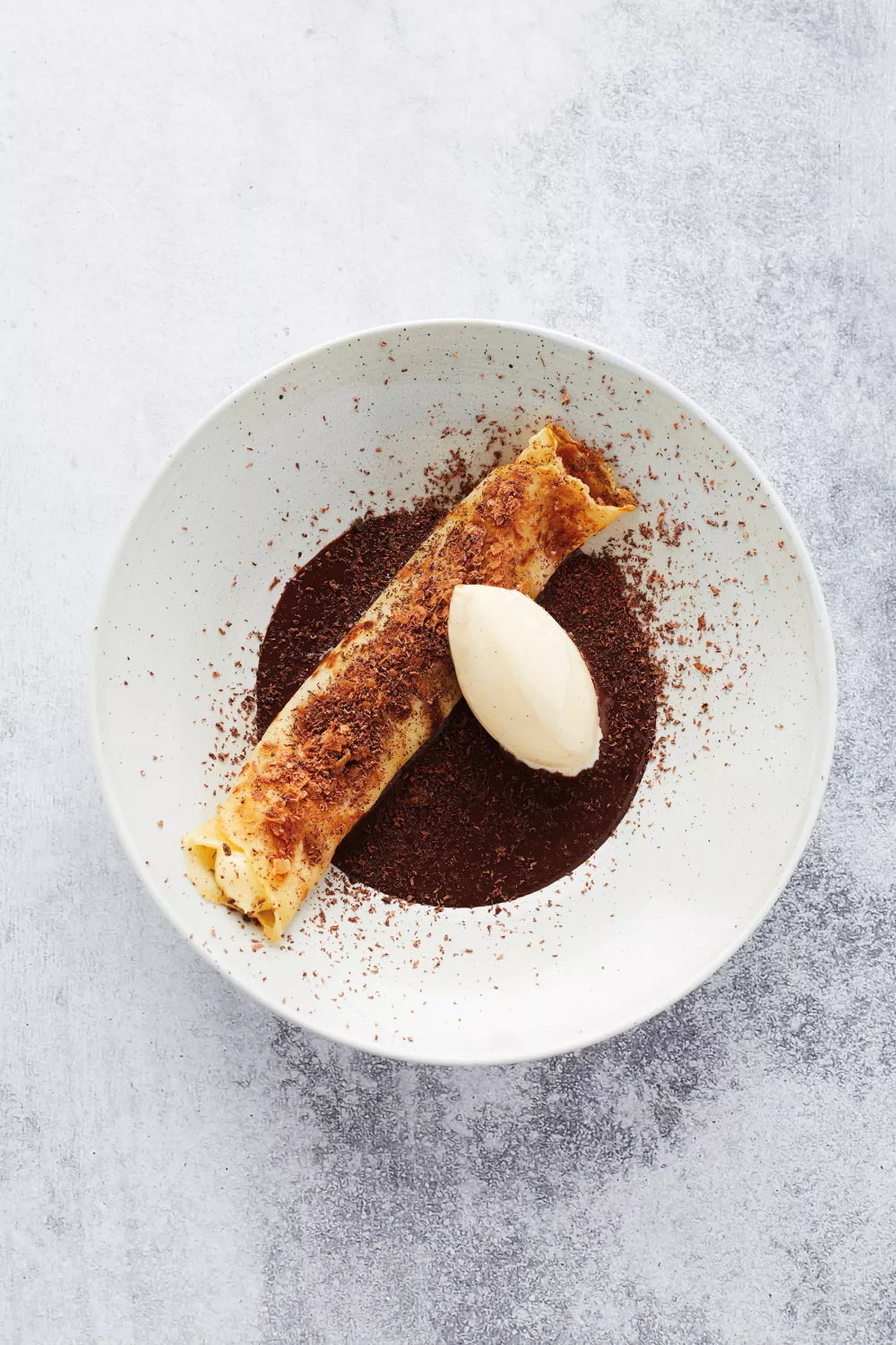 Voor de pannenkoeken:Bak de pannenkoeken in een ingeboterde pan, vul ze met de banketbakkerscrème en rol dicht. Bestrooi met de feuilletine en de geraspte chocolade. Leg een quenelle ijs op het bord en werk af met de warme chocoladesaus.