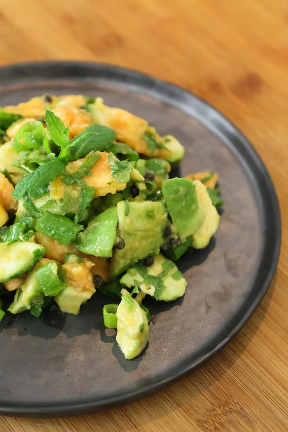 Een frisse papayasalade met romige avocado, munt en limoen is perfect als lichte lunch of zomers bijgerecht. Deze salade zonder te koken combineert blokjes papaya en avocado met fijngehakte lente ui en bieslook, licht aangemaakt met limoensap voor een kruidige, verkwikkende smaak. Snijden en mengen zijn alles wat je nodig hebt, afgemaakt met enkele knapperige papayapitjes voor extra bite.