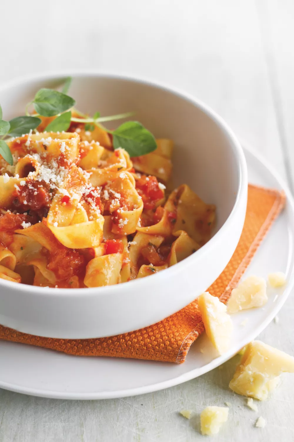 Een pittige pappardelle all'arrabbiata met sappige Romatomaten, knoflook en rode chili die warmte en Italiaanse eenvoud brengt, ideaal voor een snelle doordeweekse maaltijd of een informeel etentje en even fijn in de zomer met verse tomaten als in de winter met goede passata. Fruit ui en knoflook in olijfolie, sudder de tomaten en passata kort tot een aromatische saus en schep de brede pasta al dente erdoor. Werk af met royaal geraspte Parmezaanse kaas voor een romige toets.