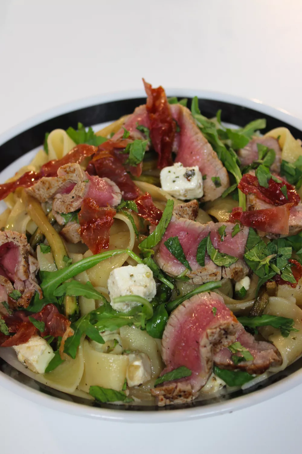 Romige pappardelle met malse steakreepjes, goudbruine groene asperges en krokante parmaham is een elegante maar eenvoudige pasta, perfect voor lenteavonden of een speciaal doordeweeks diner. Fetablokjes, limoensap en munt brengen frisse mediterrane accenten terwijl balsamicosiroop en boter zorgen voor een rijke panbaksaus en geroosterde aroma's. Werk af met rucola voor een pittige bite en serveer de in dunne plakjes gesneden steak bovenop de pasta.