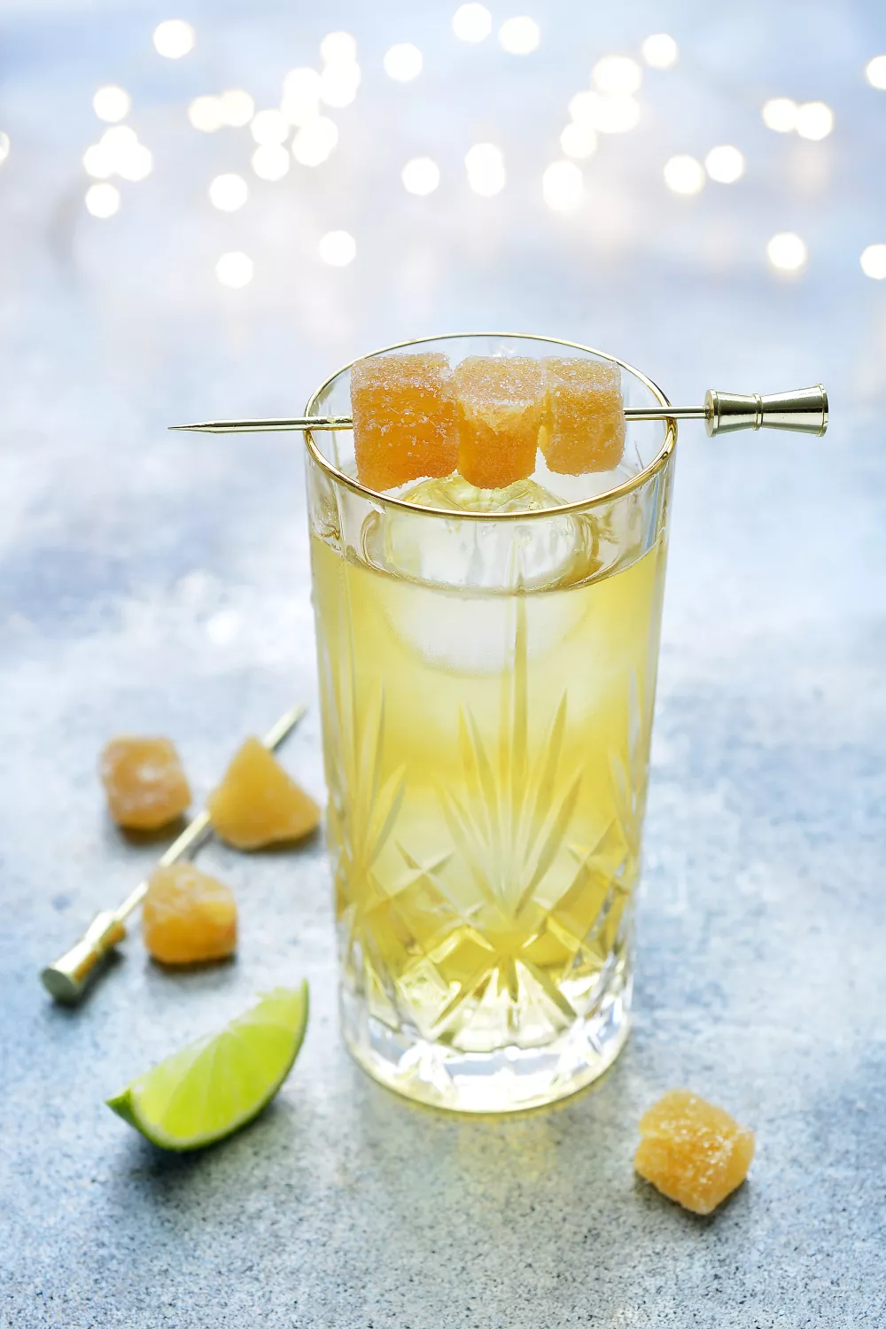 Werk af met een scheutje rokerige peated whisky, zonder te roeren en garneer met gekonfijte gember.