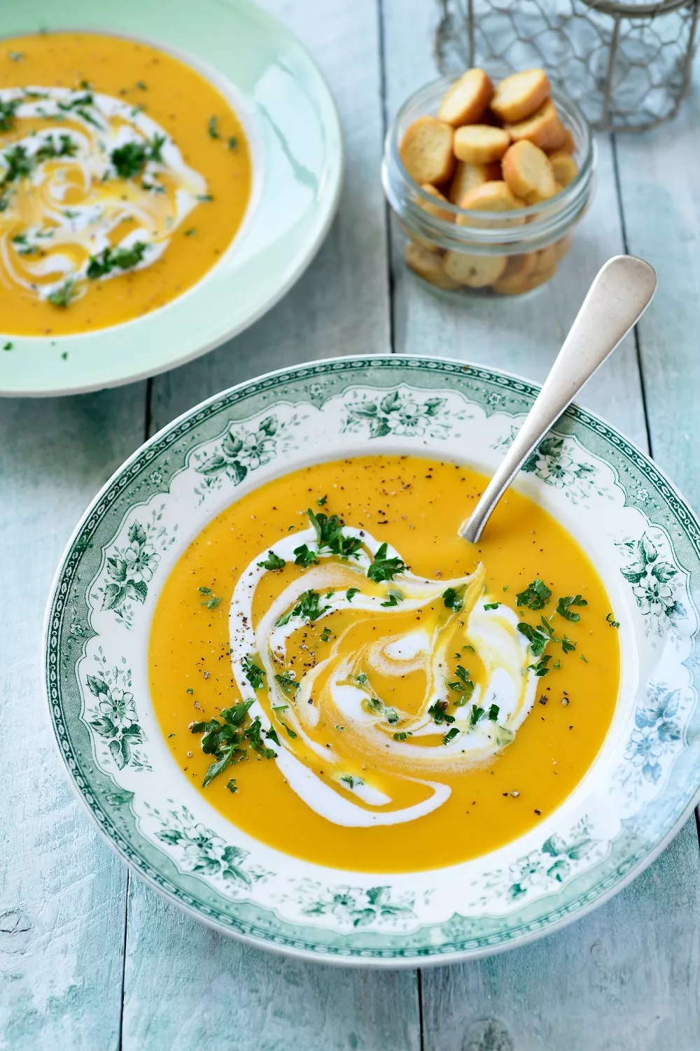 Mix glad en werk af met en scheutje kokosroom en croutons.
