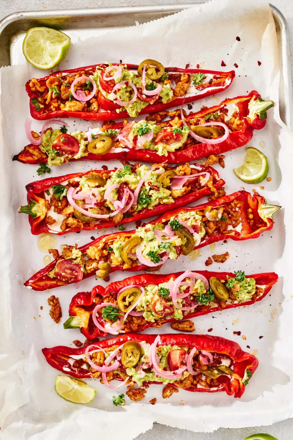 Paprikatacos met kruidig kippengehakt en romige guacamole zijn perfect voor een zomerse borrel of een snelle doordeweekse maaltijd. Gegrilde puntpaprika’s fungeren als frisse taco's en geven het geheel een licht rokerige smaak, terwijl het gehakt met paprikapoeder en cayenne voor hartige pit zorgt. Romige avocado met limoen en kerstomaatjes maakt dit kleurrijke, eenvoudige gerecht helemaal af.