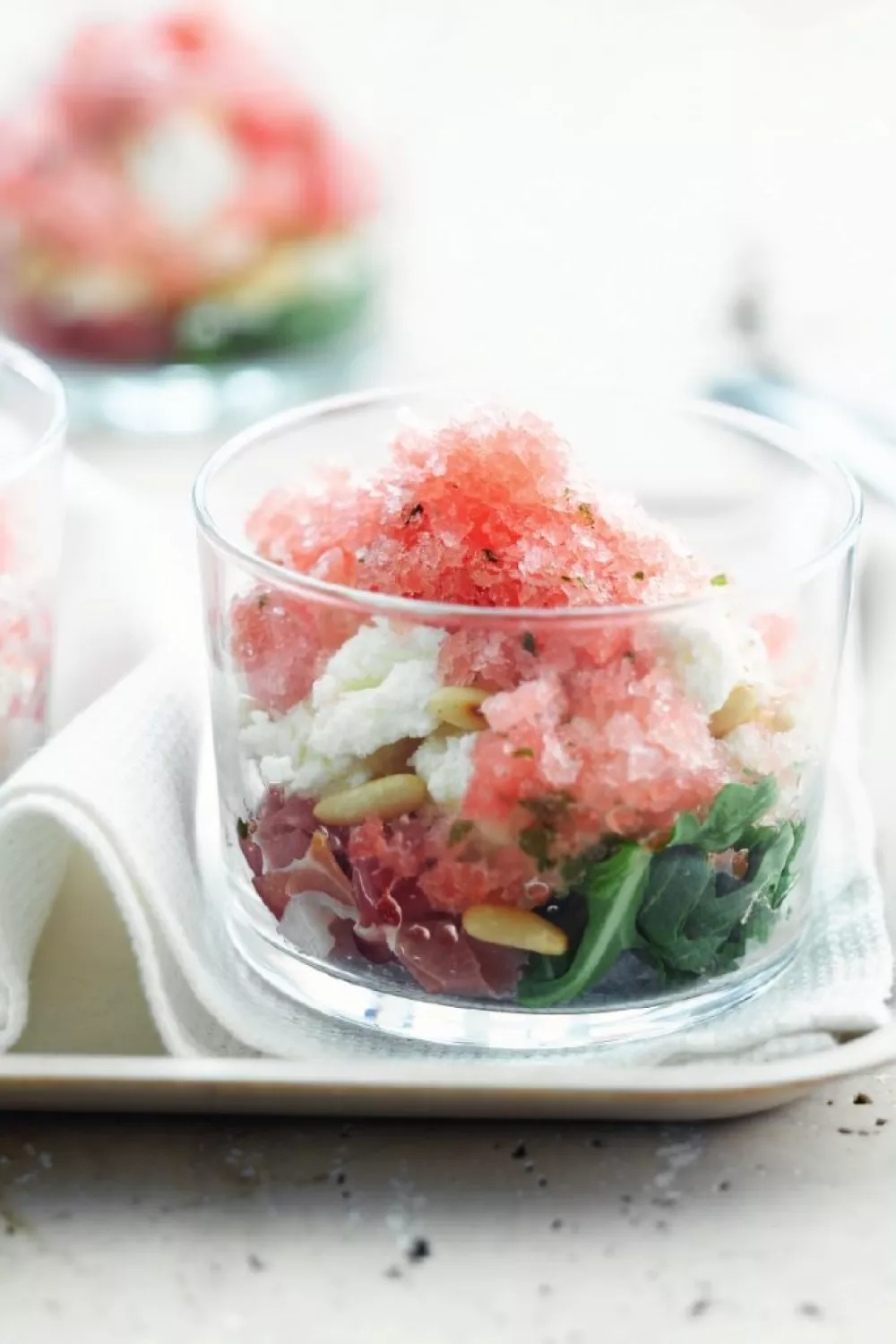 Zomers en fris zijn deze hapjes met parmaham: sappige watermeloen wordt gecombineerd met zoute feta, munt en raketsla voor een lichte, mediterrane smaak. Geroosterde pijnboompitten geven knapperigheid en een granité van bevroren watermeloen zorgt voor een ijzige, verkwikkende toets. Perfect als borrelhapje of voorgerecht bij een zomerse barbecue of picknick.