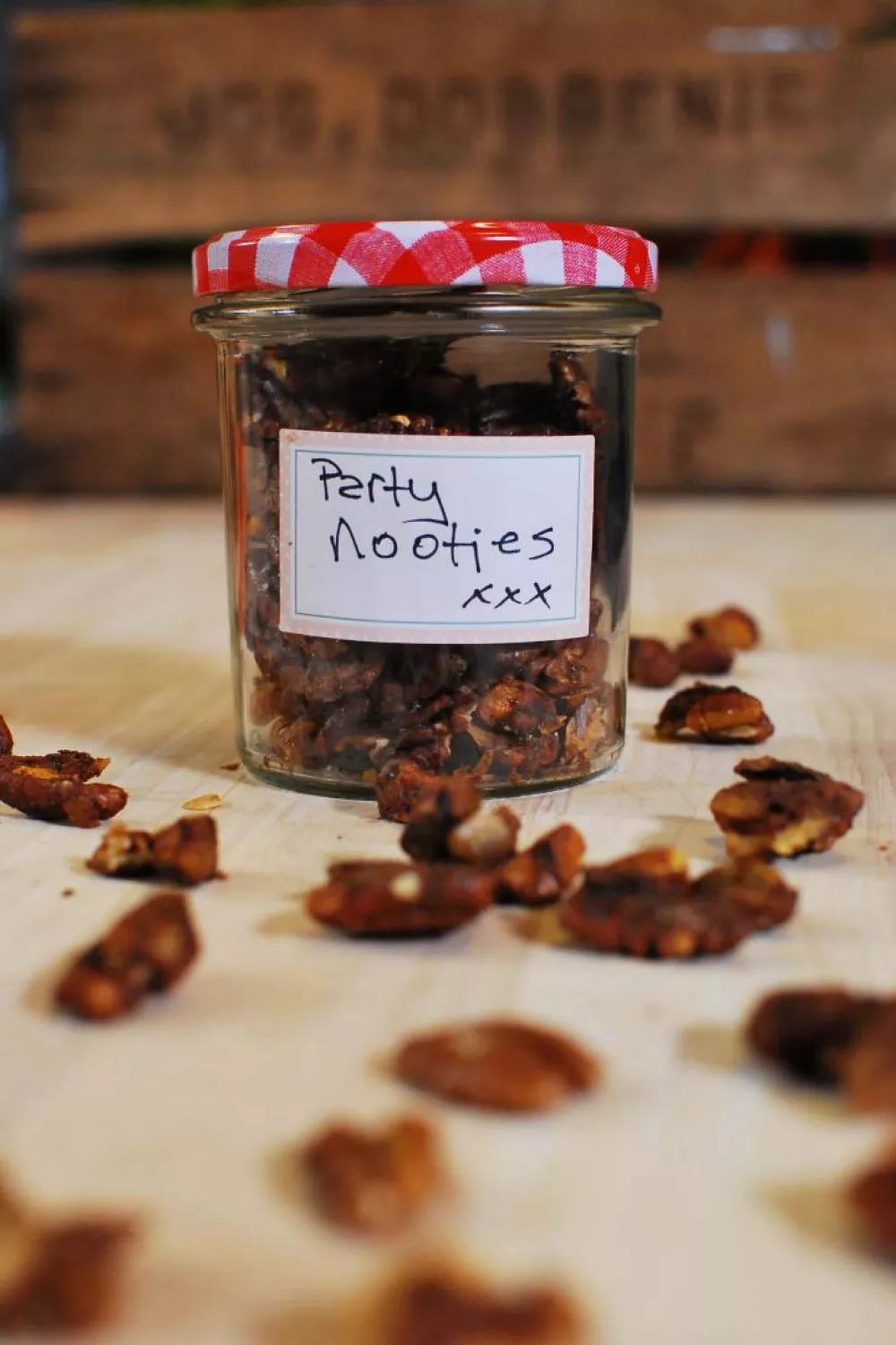 Deze knapperige partynootjes combineren gemengde noten met palmsuiker en een verwarmende mix van gember, komijn, kaneel en cayenne voor een licht pittige en zoete smaak. De noten worden met eiwit en kruiden bedekt en zacht geroosterd in de oven op 140 graden tot ze goudbruin en plakkerig zijn. Ideaal als borrelhapje bij feestjes, in de herfst en tijdens gezellige winteravonden.