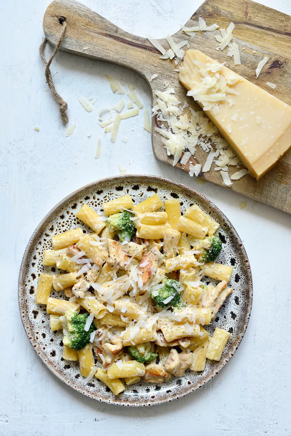 Deze romige pasta Alfredo met broccoli en kip combineert volle room, boter en Parmezaanse kaas tot een rijk en troostrijk gerecht. Rigatoni met knapperige broccoliroosjes en goudbruin gebakken kip krijgt extra smaak door geperste knoflook en het zachtjes laten inkoken van de saus. Een snel en gezellig doordeweeks diner dat in elk seizoen smaakt en perfect is voor liefhebbers van klassieke Italiaanse comfort food.
