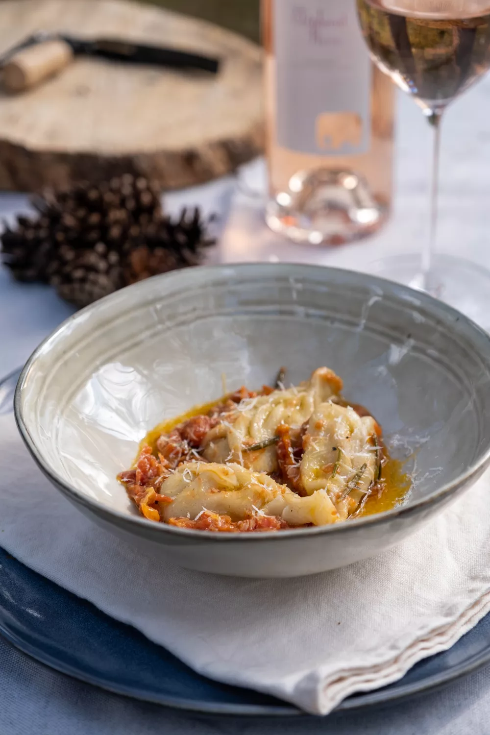 Culurgiones zijn Sardijnse gevulde pasta met een smeuïge puree van gepofte aardappel en aardpeer, verrijkt met geraspte Pecorino en frisse munt. De handgevormde knoopjes worden geserveerd in een zachte gestoofde tomatensaus met rozemarijn. Ideaal voor een zomerse lunch of een gezellig diner op het terras.