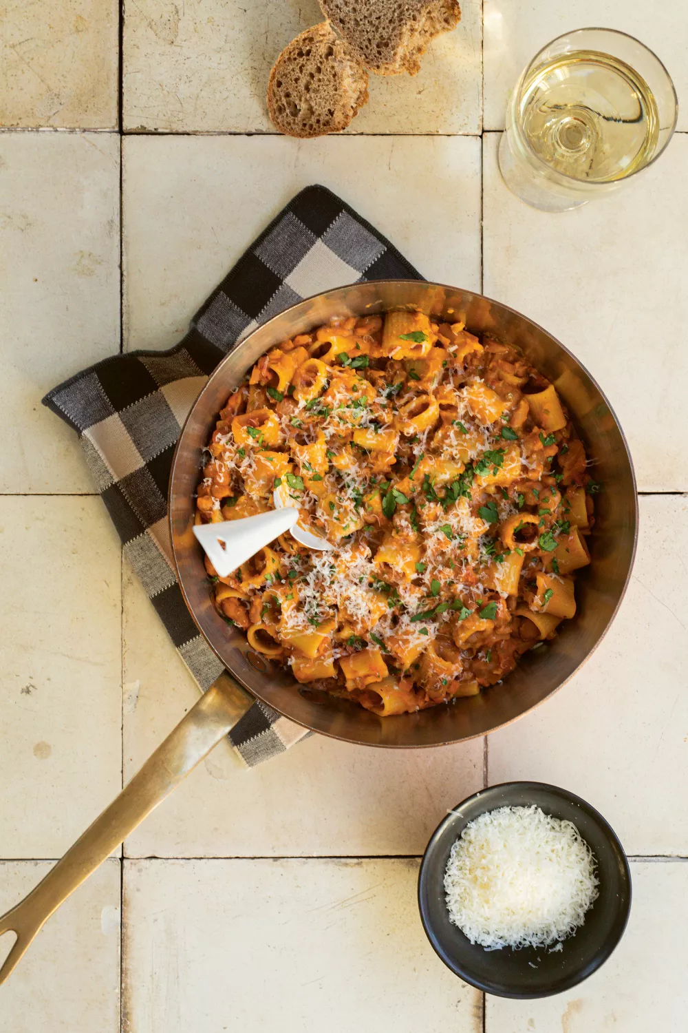 Pasta e fagioli is een hartverwarmende Italiaanse comfortschotel met borlottibonen, gepelde tomaten en korte ditaloni pasta, aangevuld met ui, wortel, bleekselderij en knoflook. Door de risottoachtige bereiding waarbij je bouillon lepel voor lepel toevoegt ontstaat een romige, zijdezachte saus met frisse peterselie en een scheut goede olijfolie. Perfect als stevige herfst- of wintermaaltijd of een smaakvolle doordeweekse pasta.