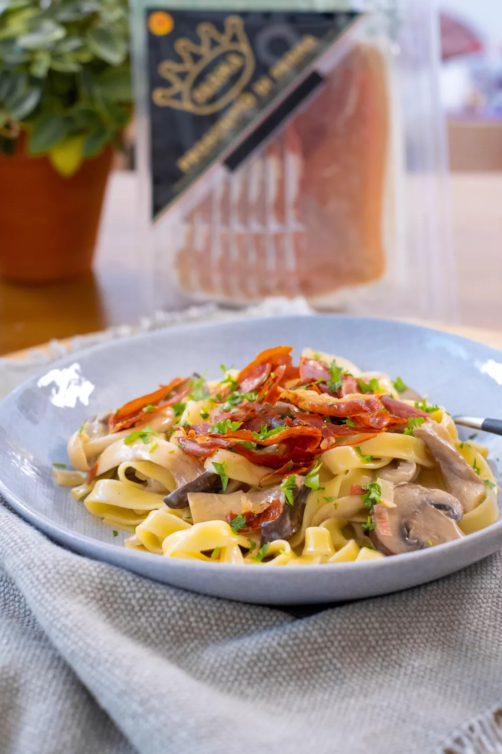 Romige papardelle met gemengde bospaddenstoelen en ovengebakken Parmaham, ideaal voor een gezellig herfstig diner. Sjalot en knoflook worden zacht aangefruit en de paddenstoelen gebakken, daarna afgeblust met kippenbouillon en room tot een fluweelachtige saus die de pasta omhult. De krokante ham en een royale rasp Parmezaanse kaas zorgen voor een zoute, knapperige afwerking.