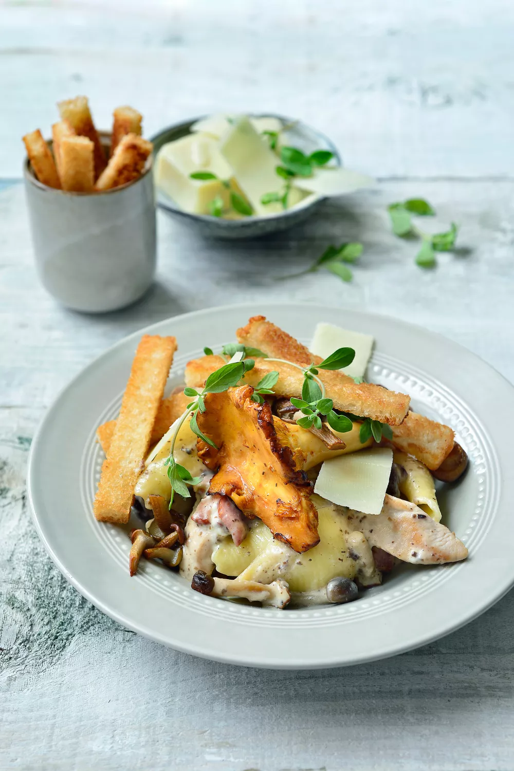 Romige pastaschelpjes met kalkoen en boschampignons combineren hartige spekreepjes, truffeltapenade en zachte geitenkaas tot een feest van umami en comfort. Door pasta kort te koken, ingrediënten te sauteren en croutons van toastbrood te bakken ontstaat een snelle doch elegante pasta voor doordeweekse diners of een gezellig herfstmaal. Een vleugje truffel en krokante broodbalkjes geven dit gerecht diepgang en textuur zonder gedoe.
