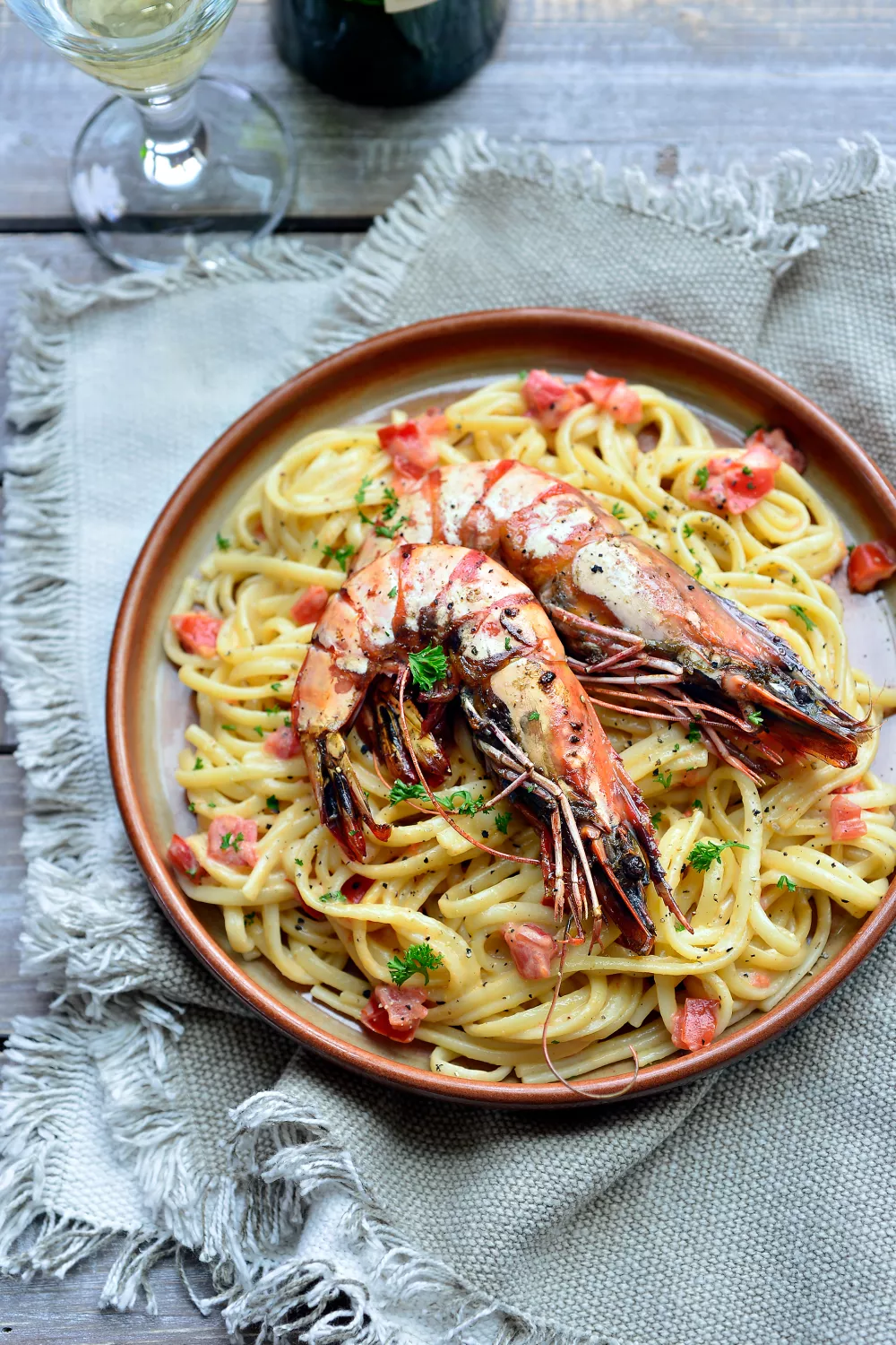 Romige pasta met kreeftensaus en sappige gambas brengt zeevruchten op tafel met een vleugje witte wijn en room. De saus wordt zacht ingekookt met kreeftenfond, tomaat en een scheut ketchup en krijgt extra diepte door in boter gebakken gambas voor een feestelijk maar snel hoofdgerecht. Serveer de pasta al dente en bestrooi met fijngehakte peterselie voor een smaakvolle zomerse of speciale maaltijd.