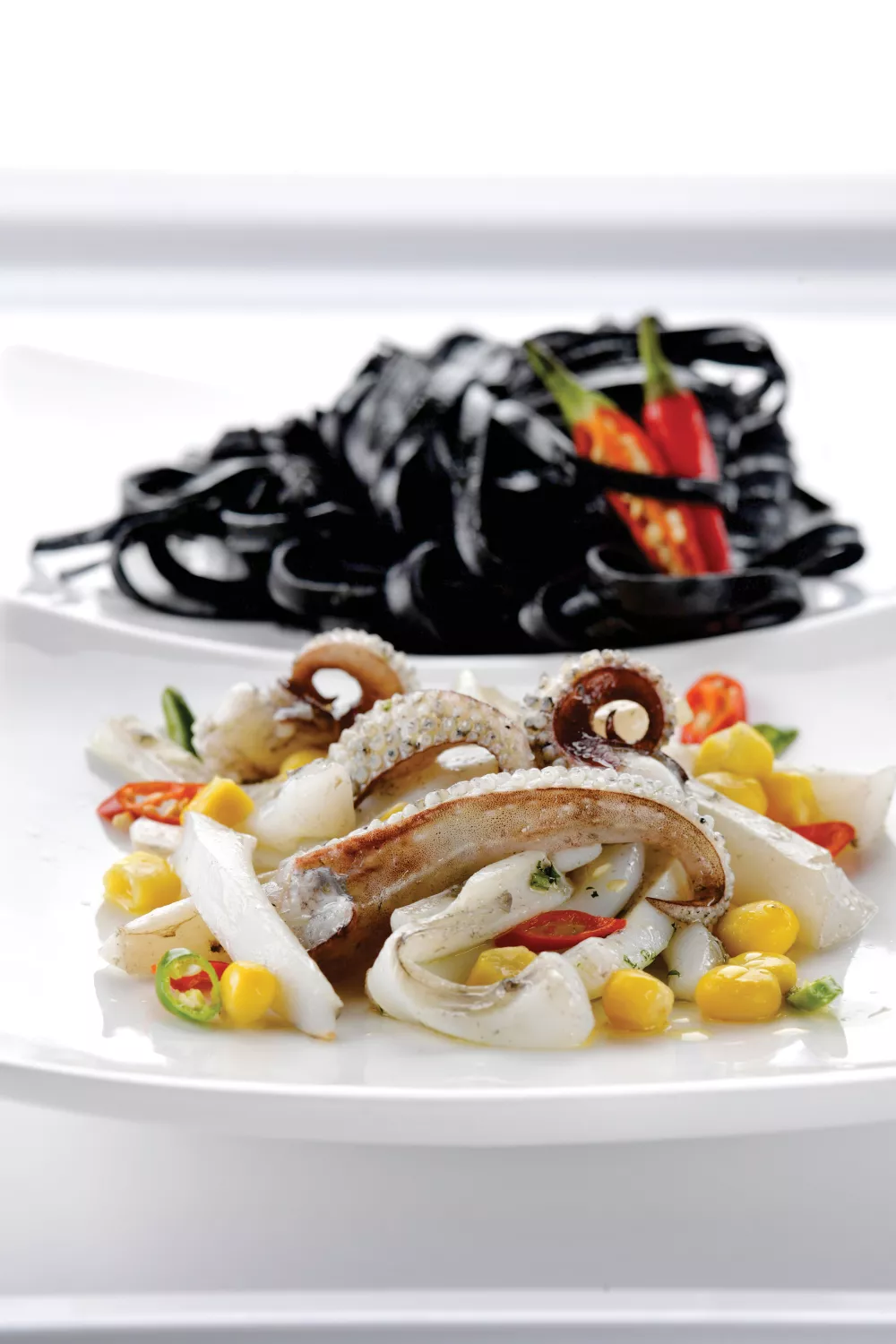 Deze pasta met krokant gebakken inktvis en zwarte verse pasta brengt zeevruchten en pittige chili samen met zoetzure limoen-sambal en knapperige maïs voor een volmondig en zomers gerecht. De inktvis wordt eerst kort gebakken en daarna gestoofd met ui en pepertjes, terwijl de saus wordt ingekookt tot hij glanzend en geconcentreerd is. Perfect als smaakvolle hoofdschotel of hartige borrelhap.