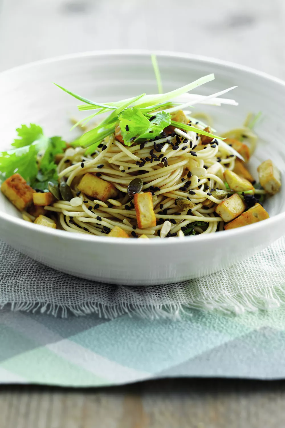 Doe de pasta, fijngesneden lente-ui, geroosterde pitten en saus in een grote mengkom. Meng tot alles goed is opgenomen. Voeg de tofu toe en meng opnieuw voorzichtig. Werk af met versnipperde koriander.