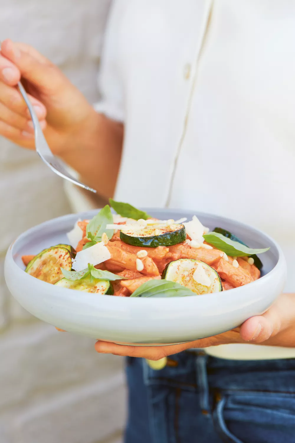 Meng de saus onder de pasta en serveer ze met de gebakken courgette, basilicum, pijnboompitten, een snufje paprikapoeder en eventueel wat Parmezaanse kaas.