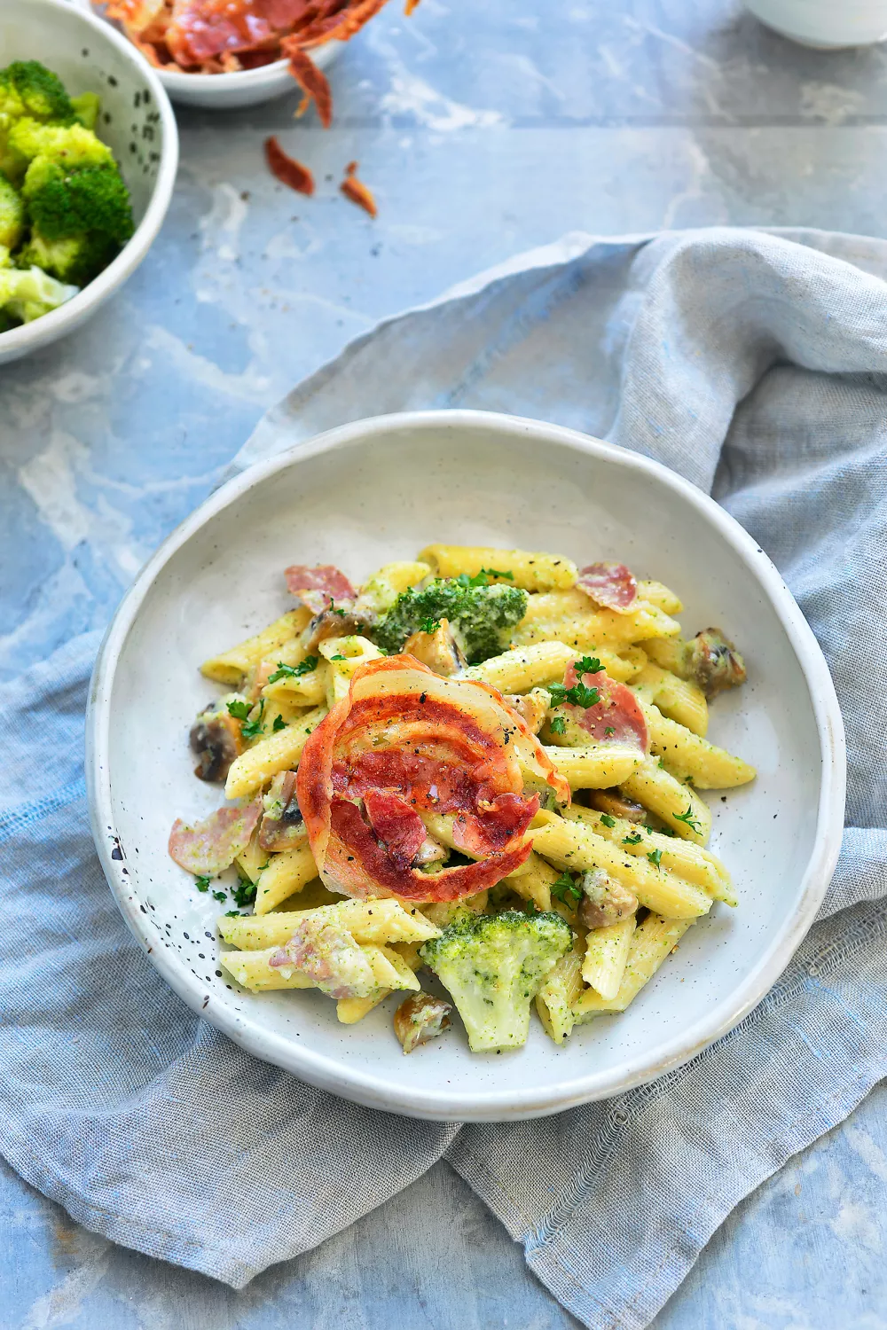 Romige penne met fluweelachtige broccolisaus, knapperige pancetta en gebakken champignons brengt comfort en smaak aan tafel. Room en geraspte Parmezaanse kaas zorgen voor een volle, rijke saus terwijl krokant gebakken pancetta en gestoofde champignons voor textuur en hartigheid zorgen. Ideaal als snelle doordeweekse pasta of als warm weekenddiner in het voorjaar en de herfst.