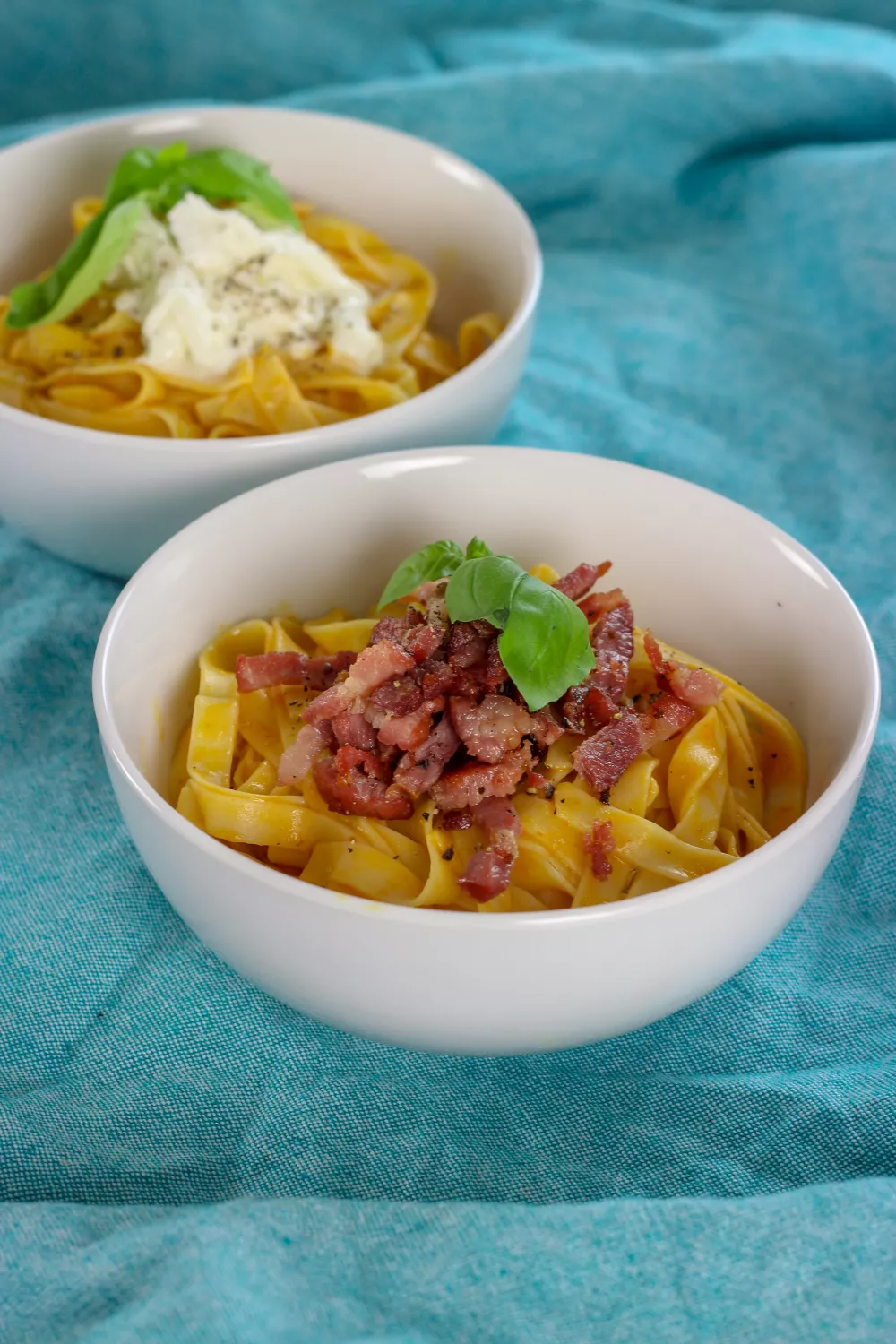 Verdeel de pasta over verschillende bordjes en werk af met de gebakken spekjes, mozzarella en basilicum.