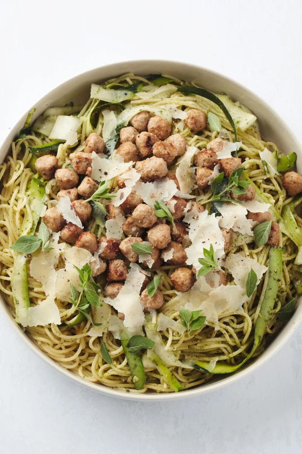 Romige pasta pesto met courgette en kippengehaktballetjes is een snelle, zomerse maaltijd vol basilicum, pittige Parmezaan en lichte courgetti. Je kookt de spaghetti kort, bakt de balletjes goudbruin en mengt alles met pesto en Parmezaanse schilfers voor een smaakvol en huiselijk gerecht. Perfect als makkelijke doordeweekse pasta of als lichte maaltijd bij warme avonden en gezellige etentjes.