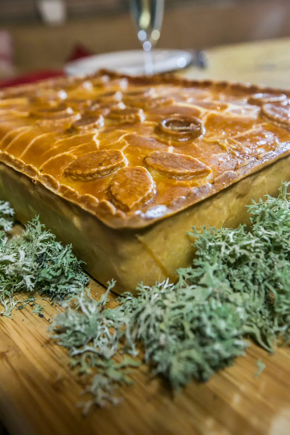 Deze rijkgevulde pâté en croûte combineert smeuïge ganzenlever, rosé kippenlevertjes en kruidig varkensvlees met morieljes, rode porto en een scheut cognac voor een diepe, feestelijke smaak. Het boterachtige deeg van bloem, boter en eieren omsluit een vulling die eerst gemarineerd, aangebakken en kort geflambeerd en vervolgens fijngemalen wordt. Perfect als elegant voorgerecht of op het koude buffet, afgewerkt met warme fond en gelatine voor glanzende, snijvaste plakjes.