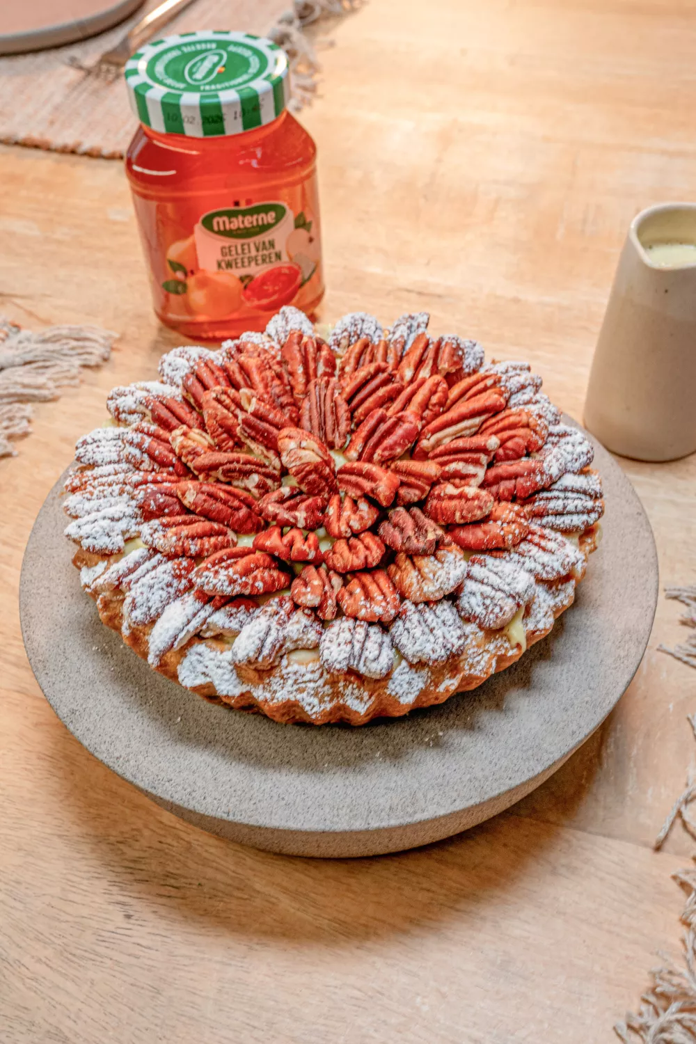 Bedek de bladerdeegbodem met en laagjee perencompote. Verdeel daarover de crème patissière en de pecannoten. Werk af met een laagje poedersuiker. Serveer met de crème anglaise.