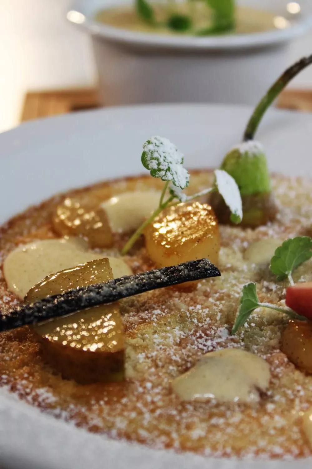Haal de peertjes met amandelcrème uit de oven. Schik de gemarineerde plakjes peer er mooi bovenop. Werk af met een laagje bloemsuiker, enkele takjes groen (bijvoorbeeld atsina cress) en de slagroomcrème.