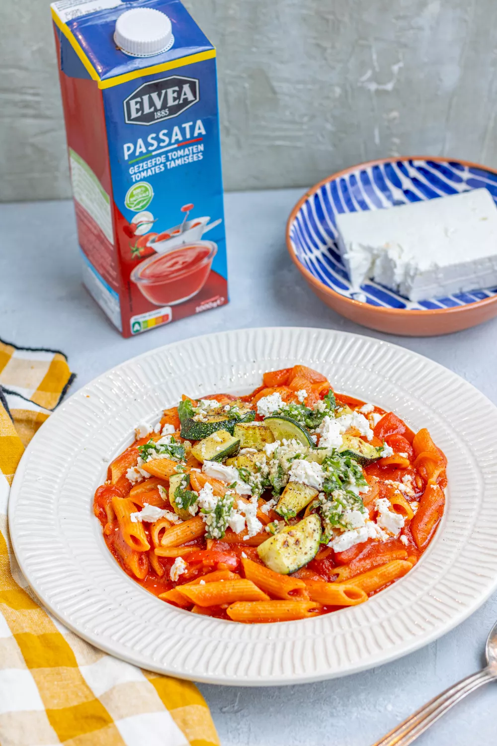 Serveer de pasta in diepe borden, verdeel de courgetteblokjes erover en verkruimel de feta. Werk af met de gremolata.