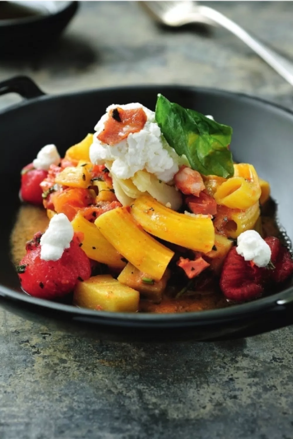 Werk de saus af met de rest van de basilicum. Giet de pasta af en roer door de saus. Schep de mortadella en mozzarella eronder en verdeel over 2 borden.
