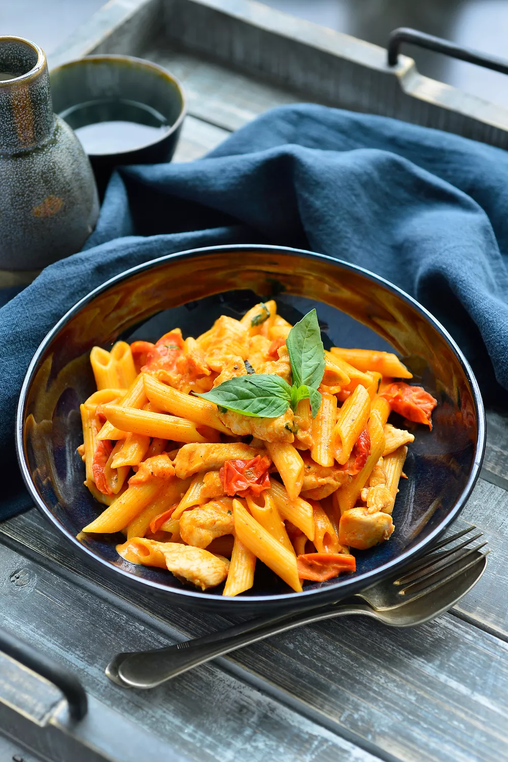Penne met kip en zongedroogde tomaten in een romige saus van room en Parmezaanse kaas: malse kipblokjes worden kort aangebakken in de olie van de tomaatjes en laten de smaken zachtjes sudderen met look en paprikapoeder. Deze snelle mediterrane pastaschotel met basilicum is ideaal voor een doordeweeks diner of een zomerse avond en blijft het lekkerst wanneer de penne al dente wordt geserveerd.