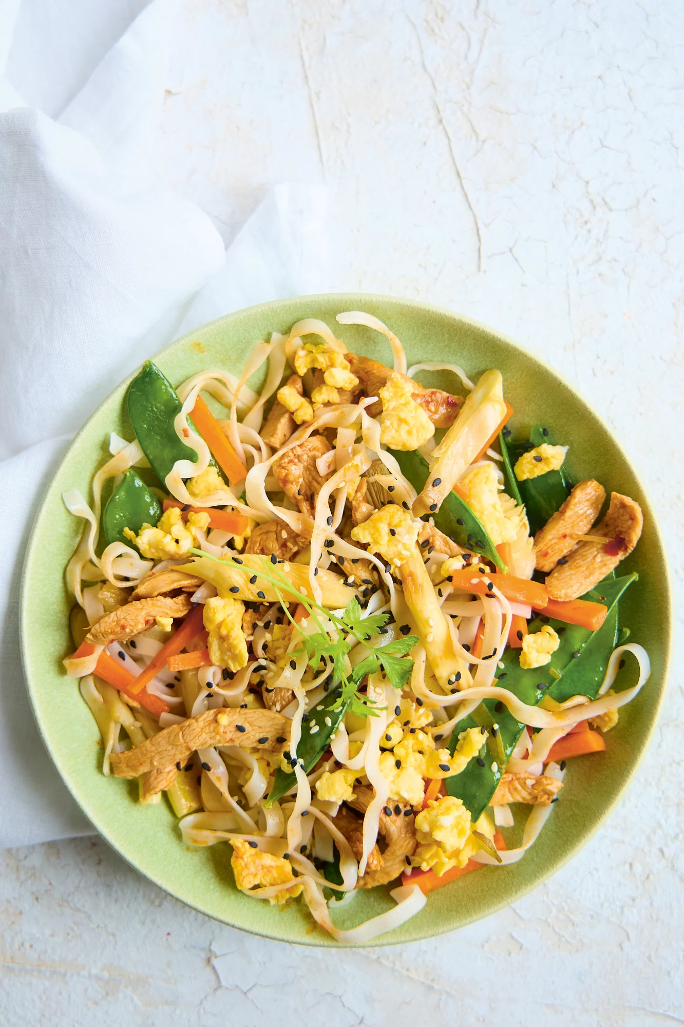 Voeg hieraan de chilisaus, het sinaasappelsap en het groene deel van de paksoi toe. Laat even sudderen. 8 Giet de pasta af. Voeg de pasta en kippenblokjes toe aan de groenten en saus.