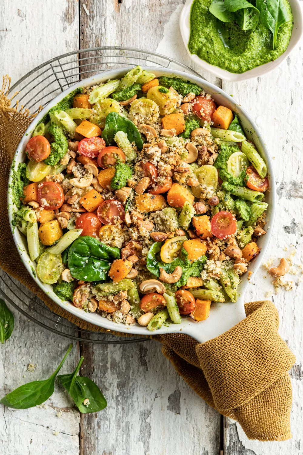 Penne met spinaziepesto, pompoen en krokante topping