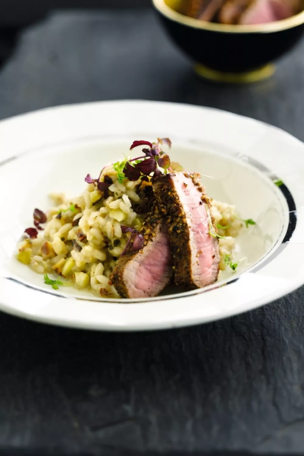 Besprenkel net voor het serveren de risotto met citroensap. Serveer samen met de peperbiefstuk.