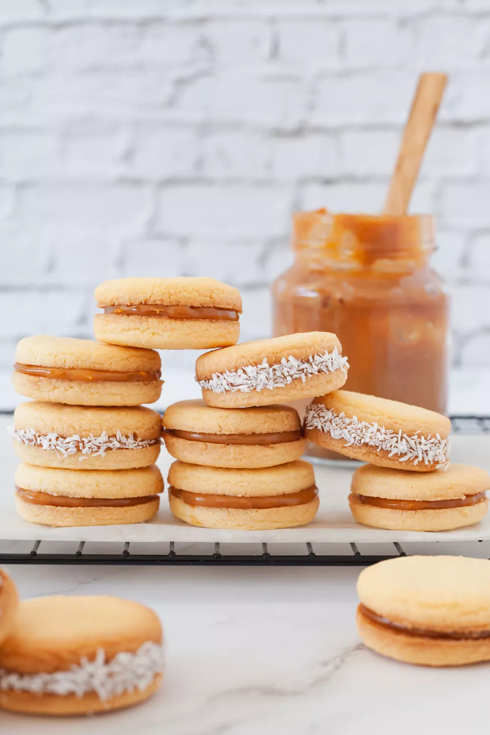 Peruaanse alfajores zijn boterige zandkoekjes met een smeltende, romige arequipevulling en een licht krokante kokosrand voor een tropisch tintje. Het deeg van maïszetmeel en bloem wordt romig geklopt, gekoeld en dun uitgerold voor een fluweelzachte textuur. Ideaal als elegant dessert bij koffie of als feestelijk tussendoortje tijdens zomerse ontvangsten.