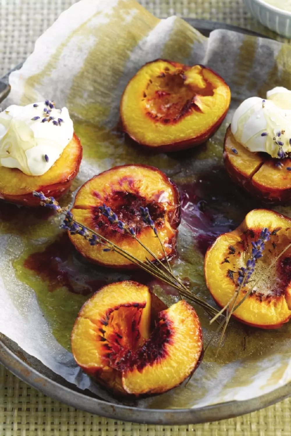 Gegrilde perziken met lavendelhoning en romige zure room zijn een zomers dessert dat het rokerige van de BBQ prachtig combineert met zachte, gekaramelliseerde vruchten. Boter en suiker zorgen voor extra karamelisatie terwijl lavendelhoning een bloemige toets geeft. Een snuf versgemalen peper maakt het geheel verrassend hartig en ideaal als afsluiter van een warme zomeravond.