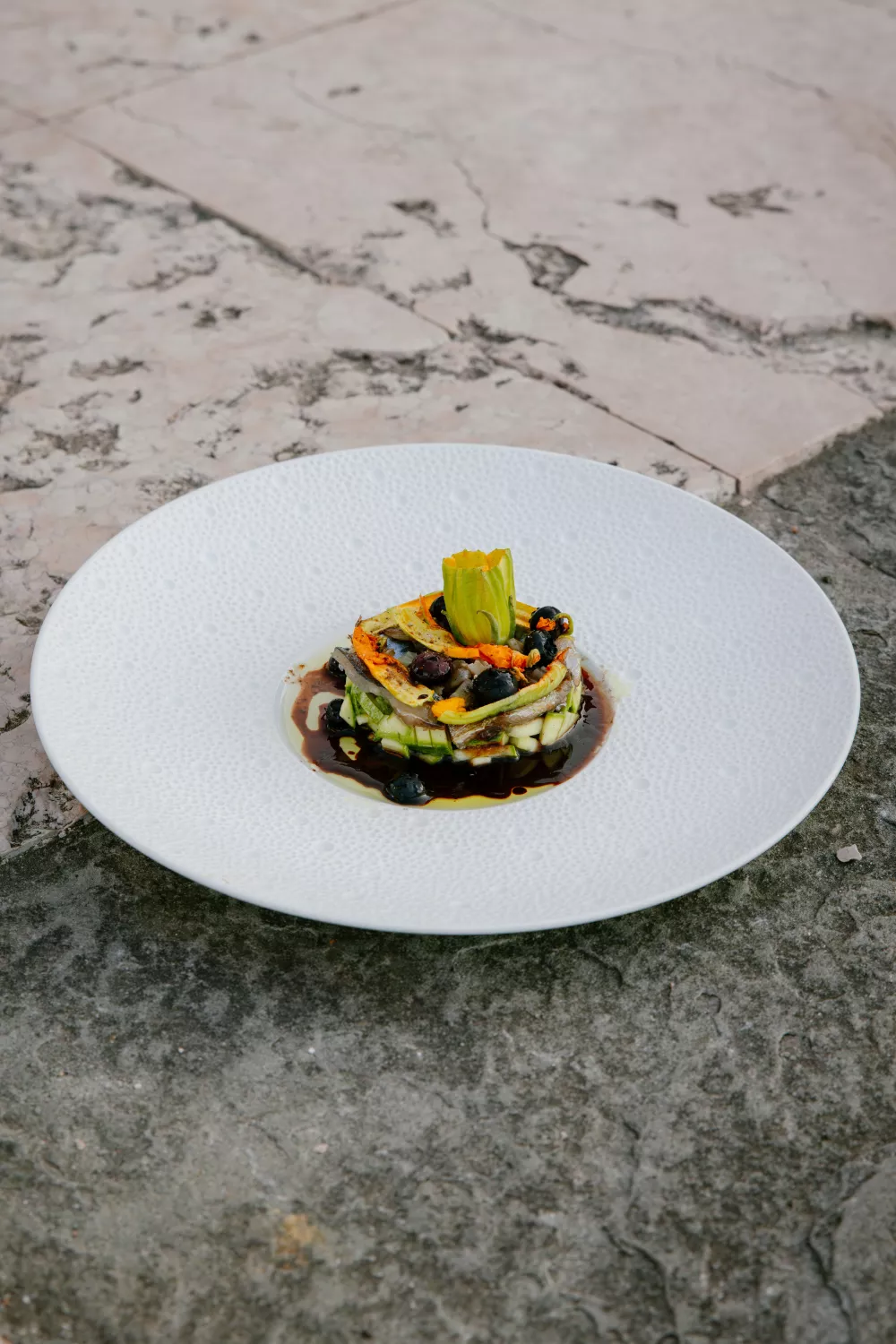 Schik de fijngehakte courgette in een dresseerring op een bord. Schik er de sardines, de gestoofde ui en venkel en de gemarineerde blauwe bessen bovenop. Werk af met stukjes courgettebloem en extra balsamico.