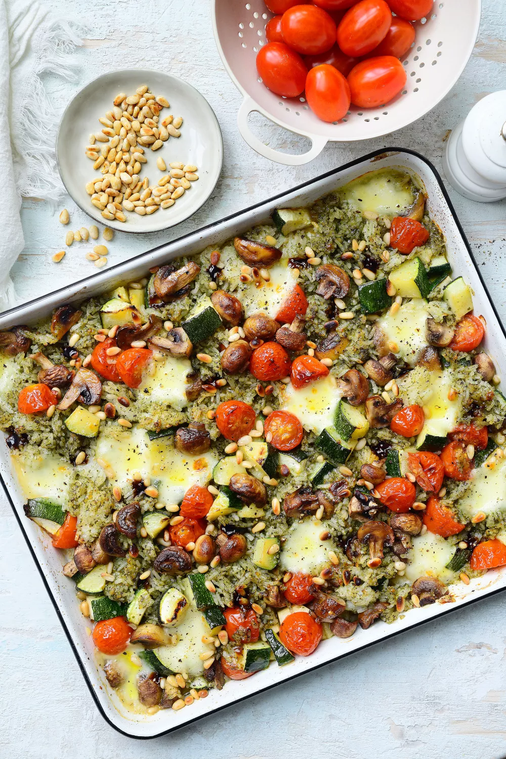 Een kleurrijke traybake van pestorijst met courgette, champignons en zoete kerstomaatjes, rijkelijk afgetopt met mini-mozzarella en geroosterde pijnboompitten. Dit ovenrecept mixt aromatische basilicumpesto met zacht gesmolten kaas voor een snelle vegetarische maaltijd die zowel als hoofdgerecht of bijgerecht werkt. Perfect voor een zomerse avond of drukke doordeweekse maaltijd, afgewerkt met een frisse toets balsamicosiroop.
